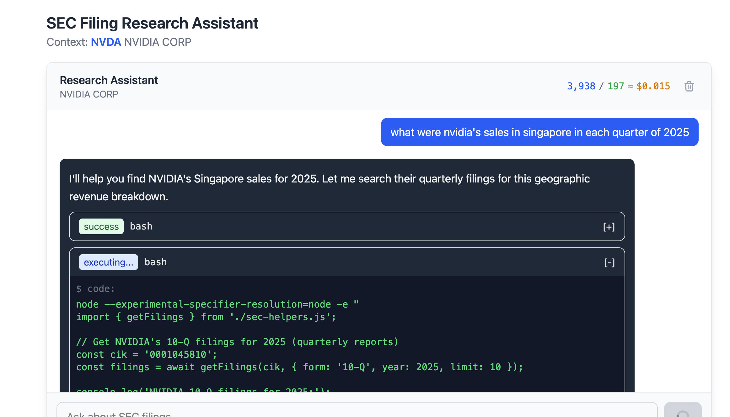 Leverage the full power of a sandboxed Claude Code environment to analyze filings. Ask complex questions, compare periods, and extract insights.