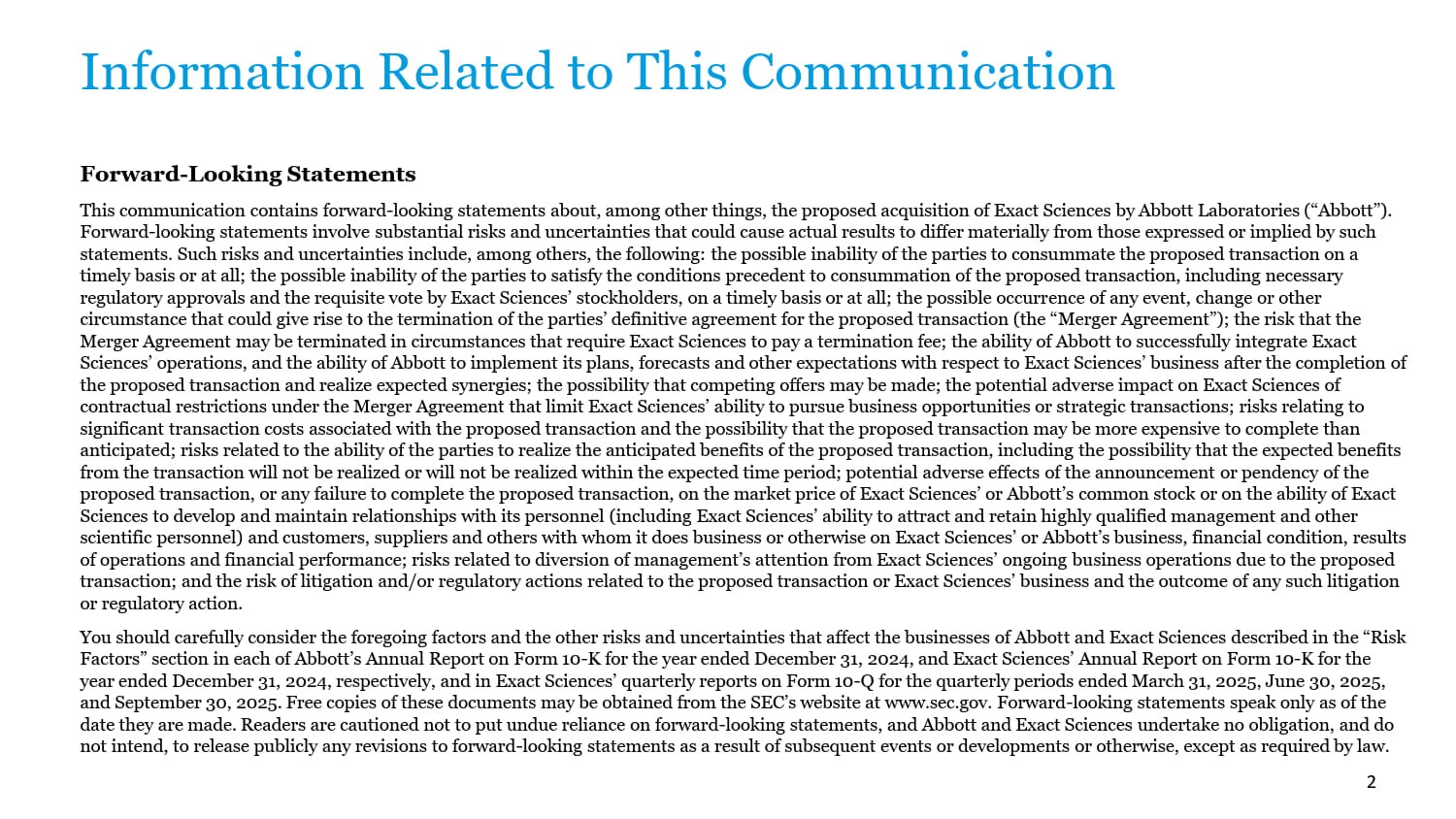 2 Information Related to This Communication 5 Forward - Looking Statements This communication contains forward - looking statements about, among other things, the proposed acquisition of Exact Sciences by Abbott Laboratories (“Abbott”). Forward - looking statements involve substantial risks and uncertainties that could cause actual results to differ materially from those expressed or implied by such statements. Such risks and uncertainties include, among others, the following: the possible inability of the parties to consu mma te the proposed transaction on a timely basis or at all; the possible inability of the parties to satisfy the conditions precedent to consummation of the prop ose d transaction, including necessary regulatory approvals and the requisite vote by Exact Sciences’ stockholders, on a timely basis or at all; the possible occurr enc e of any event, change or other circumstance that could give rise to the termination of the parties’ definitive agreement for the proposed transaction (the “ Mer ger Agreement”); the risk that the Merger Agreement may be terminated in circumstances that require Exact Sciences to pay a termination fee; the ability of Abbo tt to successfully integrate Exact Sciences’ operations, and the ability of Abbott to implement its plans, forecasts and other expectations with respect to Exac t S ciences’ business after the completion of the proposed transaction and realize expected synergies; the possibility that competing offers may be made; the potential adv ers e impact on Exact Sciences of contractual restrictions under the Merger Agreement that limit Exact Sciences’ ability to pursue business opportunities or st rat egic transactions; risks relating to significant transaction costs associated with the proposed transaction and the possibility that the proposed transaction may be more expensive to complete than anticipated; risks related to the ability of the parties to realize the anticipated benefits of the proposed transaction, inc lud ing the possibility that the expected benefits from the transaction will not be realized or will not be realized within the expected time period; potential adverse effects of the announcement or pendency of the proposed transaction, or any failure to complete the proposed transaction, on the market price of Exact Sciences’ or Abbott’s co mmon stock or on the ability of Exact Sciences to develop and maintain relationships with its personnel (including Exact Sciences’ ability to attract and retain hi ghl y qualified management and other scientific personnel) and customers, suppliers and others with whom it does business or otherwise on Exact Sciences’ or Abbot t’s business, financial condition, results of operations and financial performance; risks related to diversion of management’s attention from Exact Sciences’ ongoing bu sin ess operations due to the proposed transaction; and the risk of litigation and/or regulatory actions related to the proposed transaction or Exact Sciences’ busi nes s and the outcome of any such litigation or regulatory action. You should carefully consider the foregoing factors and the other risks and uncertainties that affect the businesses of Abbot t a nd Exact Sciences described in the “Risk Factors” section in each of Abbott’s Annual Report on Form 10 - K for the year ended December 31, 2024, and Exact Sciences’ Annual Report on Form 10 - K for the year ended December 31, 2024, respectively, and in Exact Sciences’ quarterly reports on Form 10 - Q for the quarterly periods ende d March 31, 2025, June 30, 2025, and September 30, 2025. Free copies of these documents may be obtained from the SEC’s website at www.sec.gov. Forward - looking st atements speak only as of the date they are made. Readers are cautioned not to put undue reliance on forward - looking statements, and Abbott and Exact Sciences undertake no obligation, and do not intend, to release publicly any revisions to forward - looking statements as a result of subsequent events or developments or otherwise, except as required by law.