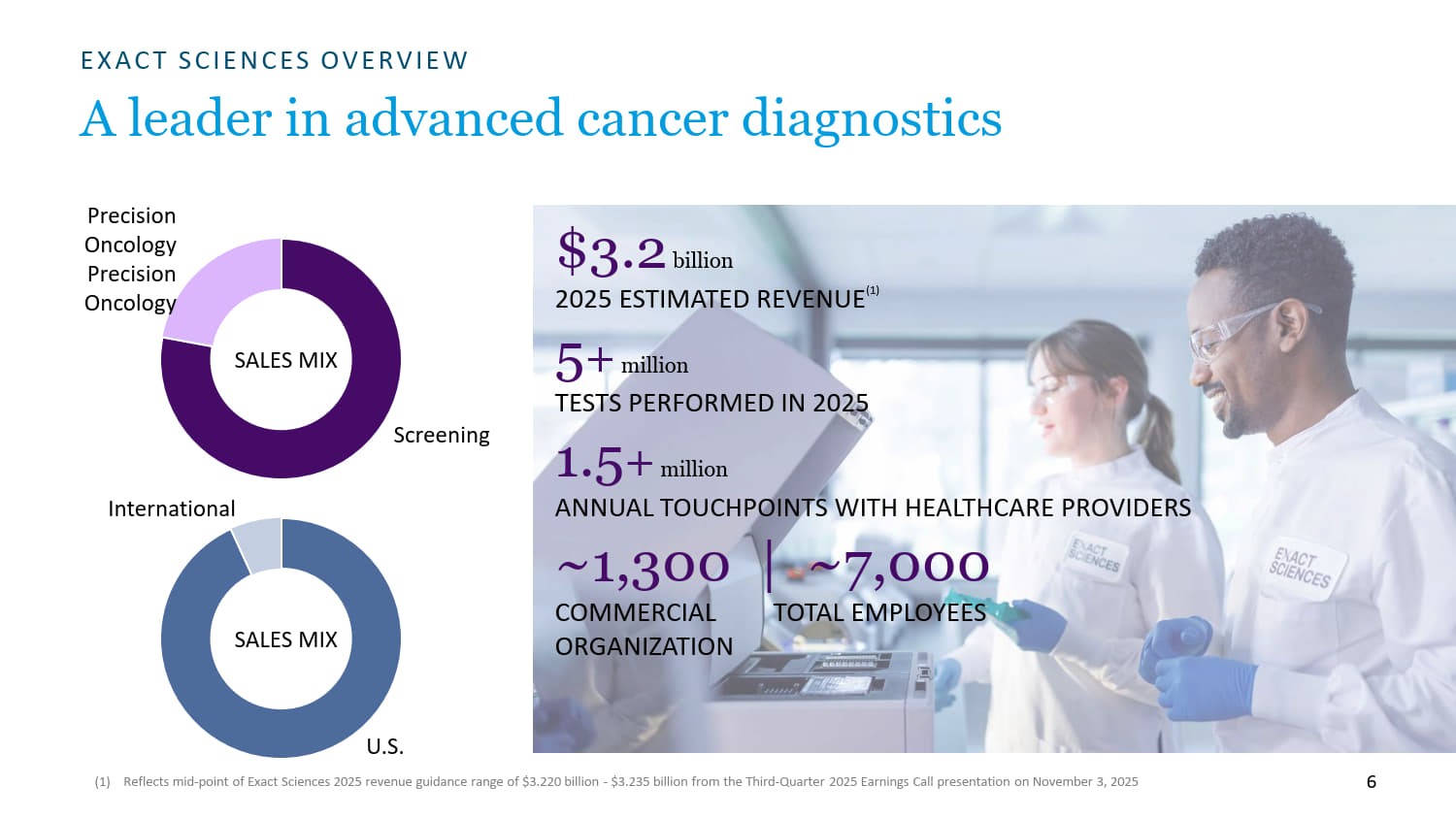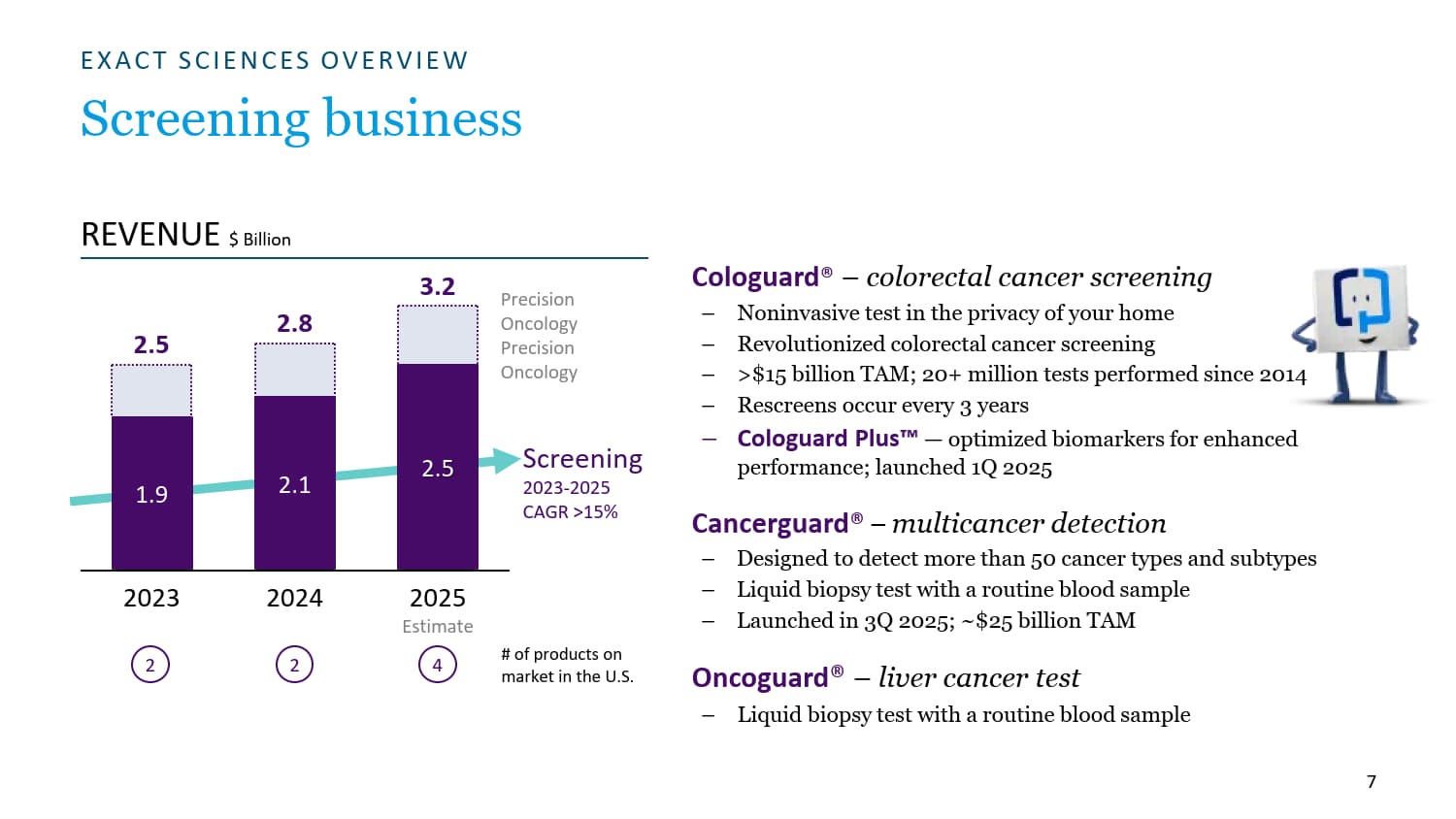 EXACT SCIENCES OVERVIEW 6 A leader in advanced cancer diagnostics Screening Precision Oncology Precision Oncology SALES MIX U.S. International SALES MIX 5 + million TESTS PERFORMED IN 2025 ~1,300 | ~7,000 COMMERCIAL TOTAL EMPLOYEES ORGANIZATION 1.5 + million ANNUAL TOUCHPOINTS WITH HEALTHCARE PROVIDERS $3.2 billion 2025 ESTIMATED REVENUE (1) (1) Reflects mid - point of Exact Sciences 2025 revenue guidance range of $3.220 billion - $3.235 billion from the Third - Quarte r 2025 Earnings Call presentation on November 3, 2025