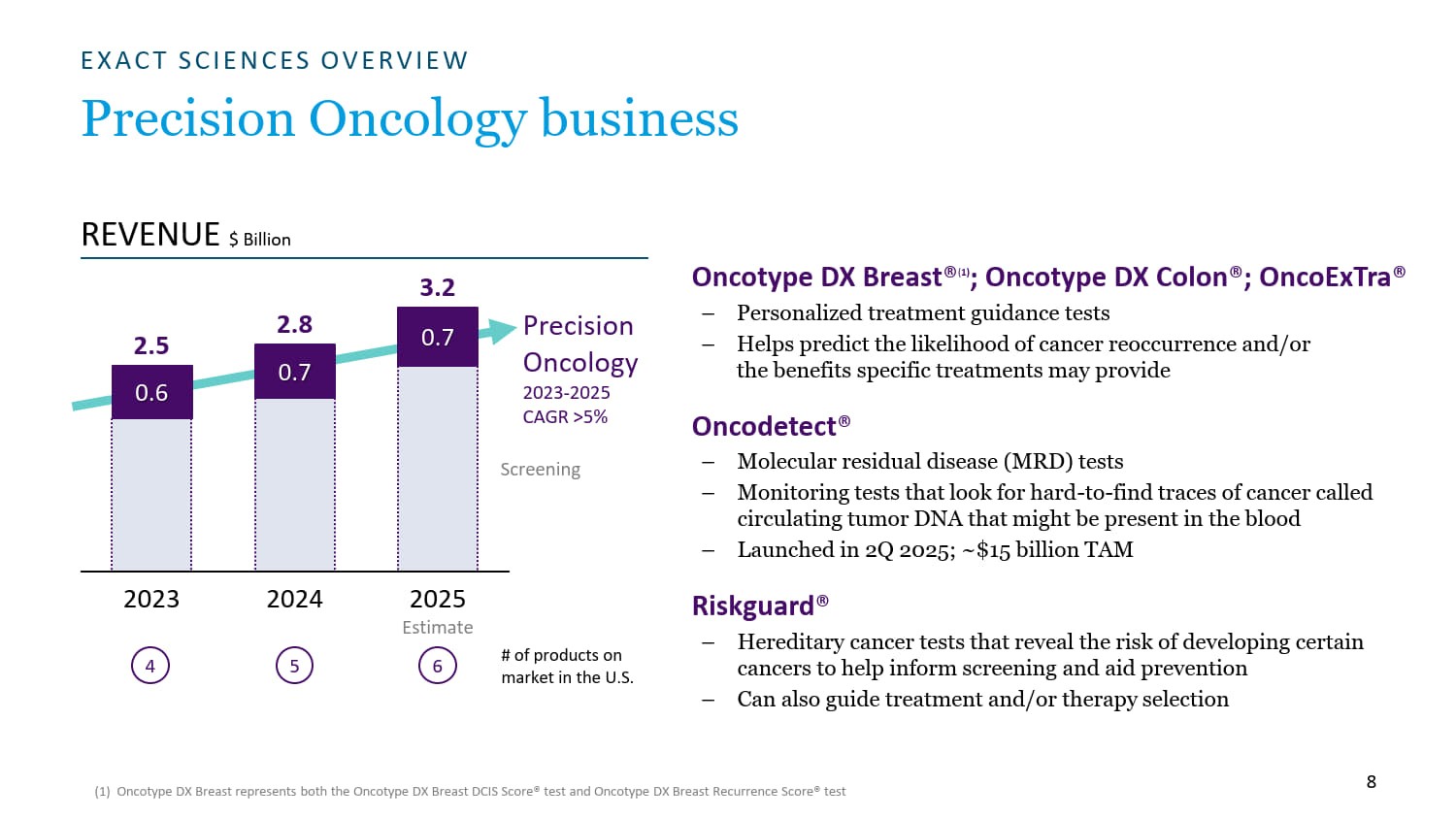 Cologuard ® – colorectal cancer screening – Noninvasive test in the privacy of your home – Revolutionized colorectal cancer screening – >$15 billion TAM; 20+ million tests performed since 2014 – Rescreens occur every 3 years – Cologuard Plus — optimized biomarkers for enhanced performance; launched 1Q 2025 Cancerguard ® – multicancer detection – Designed to detect more than 50 cancer types and subtypes – Liquid biopsy test with a routine blood sample – Launched in 3Q 2025; ~$25 billion TAM Oncoguard ® – liver cancer test – Liquid biopsy test with a routine blood sample EXACT SCIENCES OVERVIEW 7 Screening business 1.9 2023 2.1 2024 2.5 2025 Estimate Precision Oncology Precision Oncology 2.5 2.8 3.2 REVENUE $ Billion 2 2 4 # of products on market in the U.S. Screening 2023 - 2025 CAGR >15%