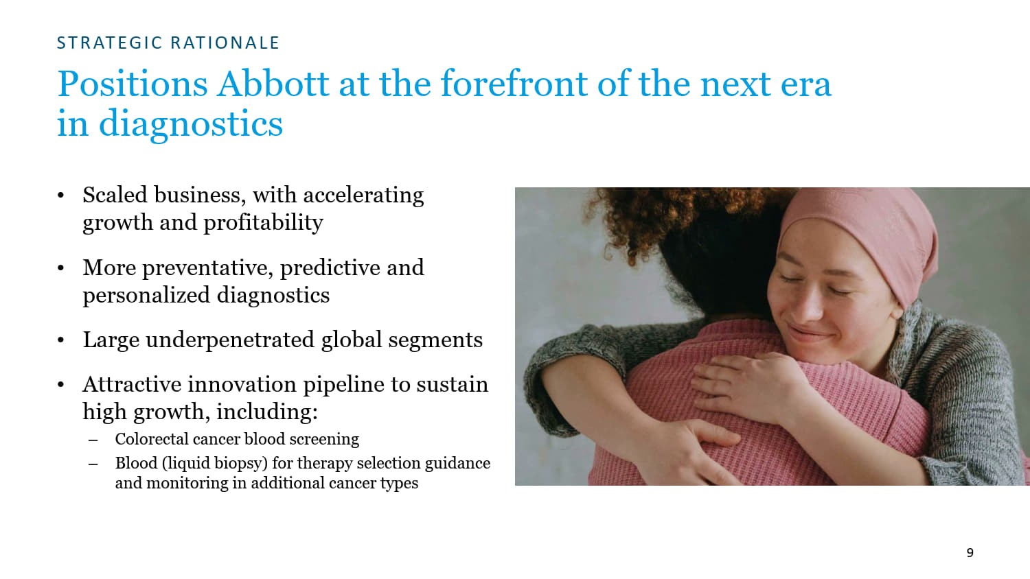 STRATEGIC RATIONALE • Scaled business, with accelerating growth and profitability • More preventative, predictive and personalized diagnostics • Large underpenetrated global segments • Attractive innovation pipeline to sustain high growth, including: – Colorectal cancer blood screening – Blood (liquid biopsy) for therapy selection guidance and monitoring in additional cancer types 9 Positions Abbott at the forefront of the next era in diagnostics