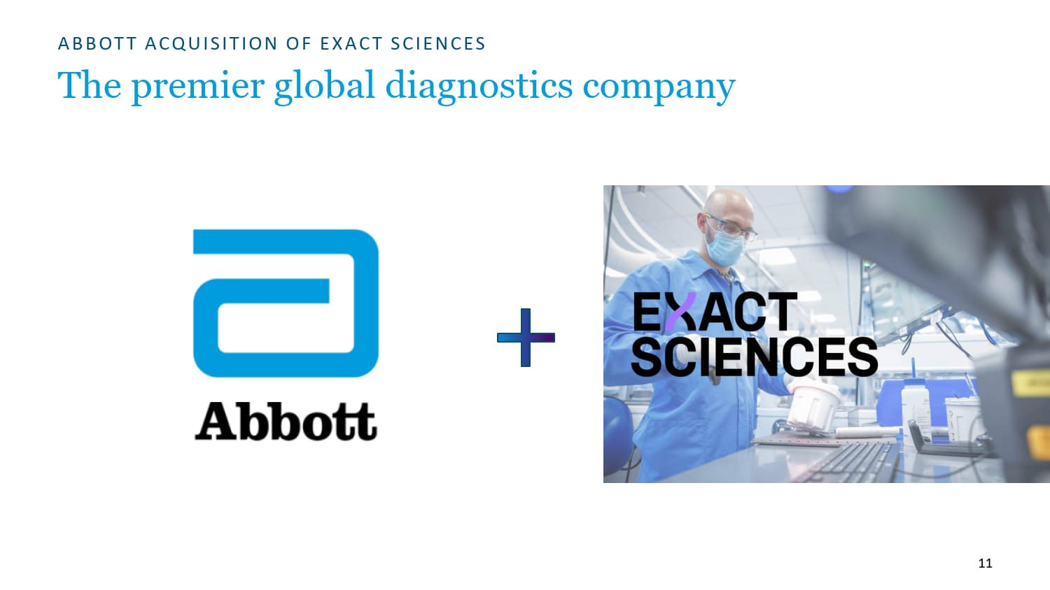 FINANCIALLY COMPELLING 10 Abbott becomes one of the leading cancer diagnostics companies in the world, doubling its TAM to >$120B $3 + billion 2025 ESTIMATED REVENUE (1) High Teens Growth 2025 ESTIMATED ORGANIC SALES GROWTH RATE 70% + 2025 ESTIMATED ADJUSTED GROSS MARGIN PROFILE EXACT SCIENCES IMPACT TO ABBOTT (2) (Annualized) TOTAL ABBOTT ABBOTT’S DIAGNOSTICS SEGMENT +300 basis points APPROXIMATE INCREASE IN SEGMENT SALES GROWTH RATE +50 basis points APPROXIMATE INCREASE IN SALES GROWTH RATE +700 basis points APPROXIMATE INCREASE IN SEGMENT ADJUSTED GROSS MARGIN PROFILE +100 basis points APPROXIMATE INCREASE IN ADJUSTED GROSS MARGIN PROFILE (1) Reflects mid - point of Exact Sciences 2025 revenue guidance range of $3.220 billion - $3.235 billion from the Third - Quarter 2025 Earnings Call presentation on November 3, 2025 (2) Impact to Abbott reflects the estimated annualized change of the pro forma combined companies versus Abbott stand - alone