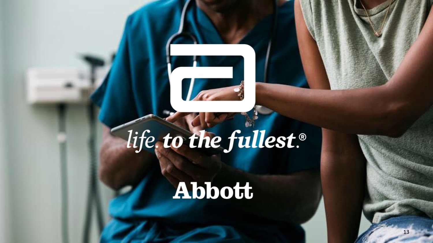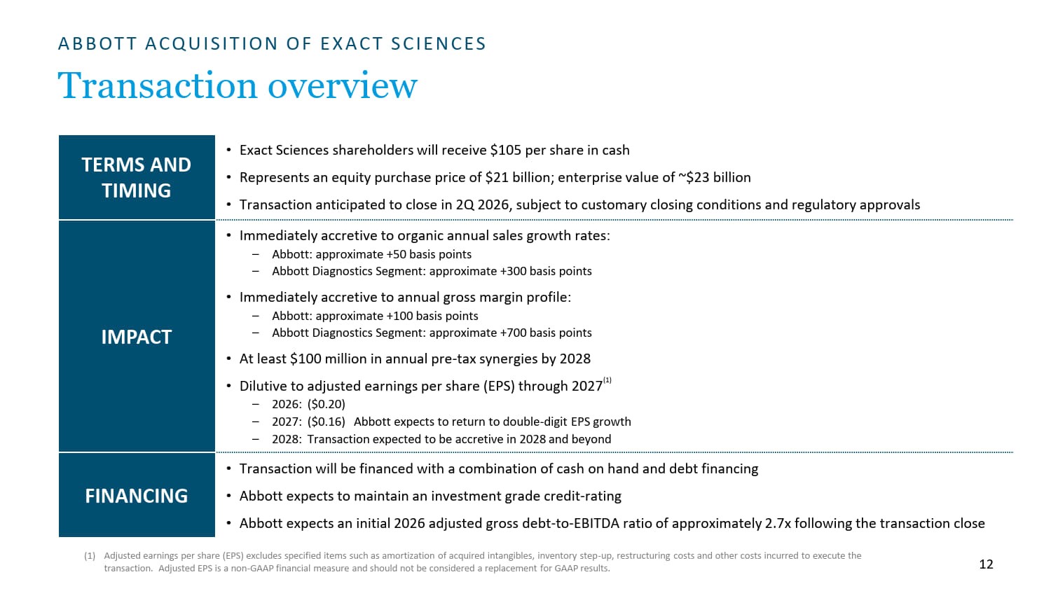 ABBOTT ACQUISITION OF EXACT SCIENCES 12 Transaction overview (1) Adjusted earnings per share (EPS) excludes specified items such as amortization of acquired intangibles, inventory step - up, rest ructuring costs and other costs incurred to execute the transaction. Adjusted EPS is a non - GAAP financial measure and should not be considered a replacement for GAAP results. • Exact Sciences shareholders will receive $105 per share in cash • Represents an equity purchase price of $21 billion; enterprise value of ~$23 billion • Transaction anticipated to close in 2Q 2026, subject to customary closing conditions and regulatory approvals TERMS AND TIMING • Immediately accretive to organic annual sales growth rates: – Abbott: approximate +50 basis points – Abbott Diagnostics Segment: approximate +300 basis points • Immediately accretive to annual gross margin profile: – Abbott: approximate +100 basis points – Abbott Diagnostics Segment: approximate +700 basis points • At least $100 million in annual pre - tax synergies by 2028 • Dilutive to adjusted earnings per share (EPS) through 2027 (1) – 2026: ($0.20) – 2027: ($0.16) Abbott expects to return to double - digit EPS growth – 2028: Transaction expected to be accretive in 2028 and beyond IMPACT • Transaction will be financed with a combination of cash on hand and debt financing • Abbott expects to maintain an investment grade credit - rating • Abbott expects an initial 2026 adjusted gross debt - to - EBITDA ratio of approximately 2.7x following the transaction close FINANCING