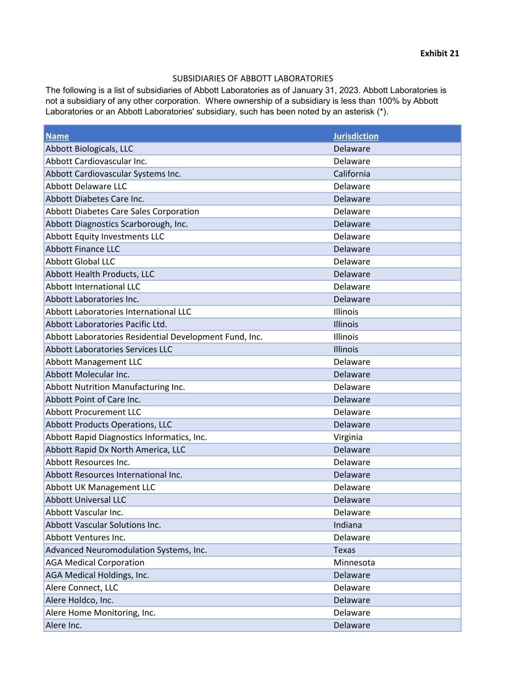 Exhibit 21 Name Jurisdiction Abbott Biologicals, LLC Delaware Abbott Cardiovascular Inc. Delaware Abbott Cardiovascular Systems Inc. California Abbott Delaware LLC Delaware Abbott Diabetes Care Inc. Delaware Abbott Diabetes Care Sales Corporation Delaware Abbott Diagnostics Scarborough, Inc. Delaware Abbott Equity Investments LLC Delaware Abbott Finance LLC Delaware Abbott Global LLC Delaware Abbott Health Products, LLC Delaware Abbott International LLC Delaware Abbott Laboratories Inc. Delaware Abbott Laboratories International LLC Illinois Abbott Laboratories Pacific Ltd. Illinois Abbott Laboratories Residential Development Fund, Inc. Illinois Abbott Laboratories Services LLC Illinois Abbott Management LLC Delaware Abbott Molecular Inc. Delaware Abbott Nutrition Manufacturing Inc. Delaware Abbott Point of Care Inc. Delaware Abbott Procurement LLC Delaware Abbott Products Operations, LLC Delaware Abbott Rapid Diagnostics Informatics, Inc. Virginia Abbott Rapid Dx North America, LLC Delaware Abbott Resources Inc. Delaware Abbott Resources International Inc. Delaware Abbott UK Management LLC Delaware Abbott Universal LLC Delaware Abbott Vascular Inc. Delaware Abbott Vascular Solutions Inc. Indiana Abbott Ventures Inc. Delaware Advanced Neuromodulation Systems, Inc. Texas AGA Medical Corporation Minnesota AGA Medical Holdings, Inc. Delaware Alere Connect, LLC Delaware Alere Holdco, Inc. Delaware Alere Home Monitoring, Inc. Delaware Alere Inc. Delaware The following is a list of subsidiaries of Abbott Laboratories as of January 31, 2023. Abbott Laboratories is not a subsidiary of any other corporation. Where ownership of a subsidiary is less than 100% by Abbott Laboratories or an Abbott Laboratories' subsidiary, such has been noted by an asterisk (*). SUBSIDIARIES OF ABBOTT LABORATORIES