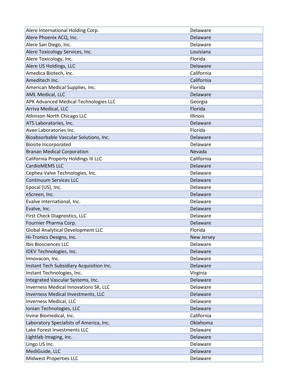 Alere International Holding Corp. Delaware Alere Phoenix ACQ, Inc. Delaware Alere San Diego, Inc. Delaware Alere Toxicology Services, Inc. Louisiana Alere Toxicology, Inc. Florida Alere US Holdings, LLC Delaware Amedica Biotech, Inc. California Ameditech Inc. California American Medical Supplies, Inc. Florida AML Medical, LLC Delaware APK Advanced Medical Technologies LLC Georgia Arriva Medical, LLC Florida Atkinson North Chicago LLC Illinois ATS Laboratories, Inc. Delaware Avee Laboratories Inc. Florida Bioabsorbable Vascular Solutions, Inc. Delaware Biosite Incorporated Delaware Branan Medical Corporation Nevada California Property Holdings III LLC California CardioMEMS LLC Delaware Cephea Valve Technologies, Inc. Delaware Continuum Services LLC Delaware Epocal (US), Inc. Delaware eScreen, Inc. Delaware Evalve International, Inc. Delaware Evalve, Inc. Delaware First Check Diagnostics, LLC Delaware Fournier Pharma Corp. Delaware Global Analytical Development LLC Florida Hi-Tronics Designs, Inc. New Jersey Ibis Biosciences LLC Delaware IDEV Technologies, Inc. Delaware Innovacon, Inc. Delaware Instant Tech Subsidiary Acquisition Inc. Delaware Instant Technologies, Inc. Virginia Integrated Vascular Systems, Inc. Delaware Inverness Medical Innovations SK, LLC Delaware Inverness Medical Investments, LLC Delaware Inverness Medical, LLC Delaware Ionian Technologies, LLC Delaware Irvine Biomedical, Inc. California Laboratory Specialists of America, Inc. Oklahoma Lake Forest Investments LLC Delaware Lightlab Imaging, Inc. Delaware Lingo US Inc. Delaware MediGuide, LLC Delaware Midwest Properties LLC Delaware