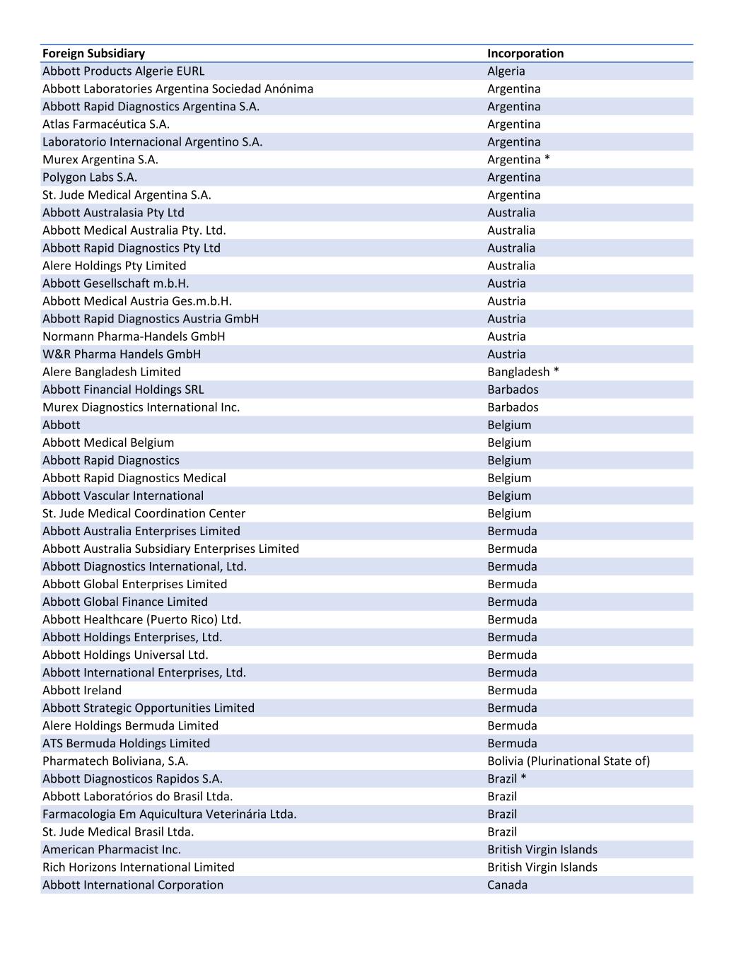 Foreign Subsidiary Incorporation Abbott Products Algerie EURL Algeria Abbott Laboratories Argentina Sociedad Anónima Argentina Abbott Rapid Diagnostics Argentina S.A. Argentina Atlas Farmacéutica S.A. Argentina Laboratorio Internacional Argentino S.A. Argentina Murex Argentina S.A. Argentina * Polygon Labs S.A. Argentina St. Jude Medical Argentina S.A. Argentina Abbott Australasia Pty Ltd Australia Abbott Medical Australia Pty. Ltd. Australia Abbott Rapid Diagnostics Pty Ltd Australia Alere Holdings Pty Limited Australia Abbott Gesellschaft m.b.H. Austria Abbott Medical Austria Ges.m.b.H. Austria Abbott Rapid Diagnostics Austria GmbH Austria Normann Pharma-Handels GmbH Austria W&R Pharma Handels GmbH Austria Alere Bangladesh Limited Bangladesh * Abbott Financial Holdings SRL Barbados Murex Diagnostics International Inc. Barbados Abbott Belgium Abbott Medical Belgium Belgium Abbott Rapid Diagnostics Belgium Abbott Rapid Diagnostics Medical Belgium Abbott Vascular International Belgium St. Jude Medical Coordination Center Belgium Abbott Australia Enterprises Limited Bermuda Abbott Australia Subsidiary Enterprises Limited Bermuda Abbott Diagnostics International, Ltd. Bermuda Abbott Global Enterprises Limited Bermuda Abbott Global Finance Limited Bermuda Abbott Healthcare (Puerto Rico) Ltd. Bermuda Abbott Holdings Enterprises, Ltd. Bermuda Abbott Holdings Universal Ltd. Bermuda Abbott International Enterprises, Ltd. Bermuda Abbott Ireland Bermuda Abbott Strategic Opportunities Limited Bermuda Alere Holdings Bermuda Limited Bermuda ATS Bermuda Holdings Limited Bermuda Pharmatech Boliviana, S.A. Bolivia (Plurinational State of) Abbott Diagnosticos Rapidos S.A. Brazil * Abbott Laboratórios do Brasil Ltda. Brazil Farmacologia Em Aquicultura Veterinária Ltda. Brazil St. Jude Medical Brasil Ltda. Brazil American Pharmacist Inc. British Virgin Islands Rich Horizons International Limited British Virgin Islands Abbott International Corporation Canada