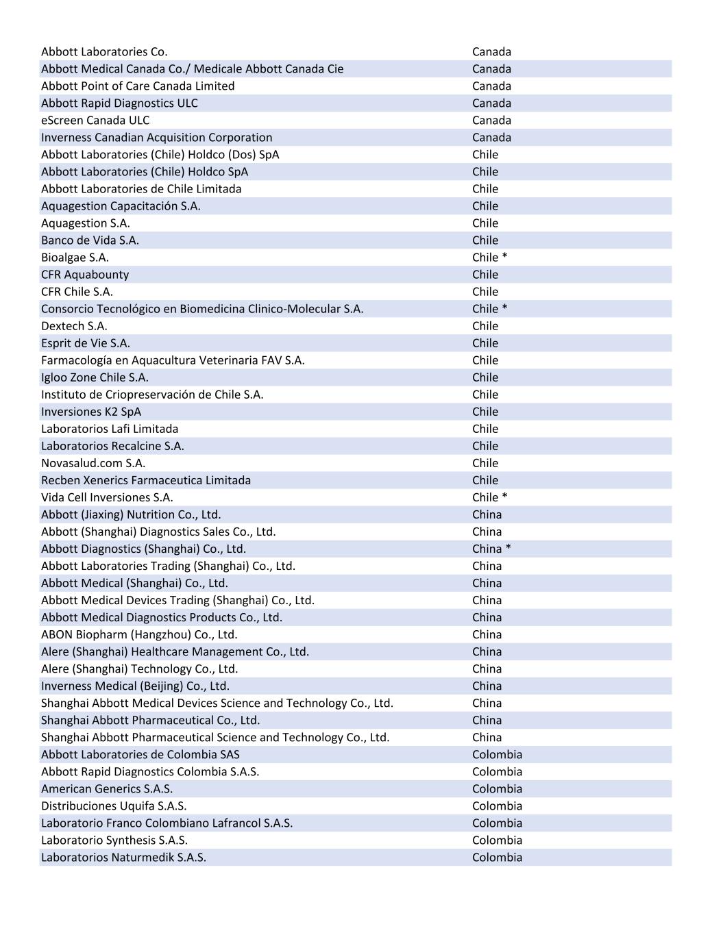 Abbott Laboratories Co. Canada Abbott Medical Canada Co./ Medicale Abbott Canada Cie Canada Abbott Point of Care Canada Limited Canada Abbott Rapid Diagnostics ULC Canada eScreen Canada ULC Canada Inverness Canadian Acquisition Corporation Canada Abbott Laboratories (Chile) Holdco (Dos) SpA Chile Abbott Laboratories (Chile) Holdco SpA Chile Abbott Laboratories de Chile Limitada Chile Aquagestion Capacitación S.A. Chile Aquagestion S.A. Chile Banco de Vida S.A. Chile Bioalgae S.A. Chile * CFR Aquabounty Chile CFR Chile S.A. Chile Consorcio Tecnológico en Biomedicina Clinico-Molecular S.A. Chile * Dextech S.A. Chile Esprit de Vie S.A. Chile Farmacología en Aquacultura Veterinaria FAV S.A. Chile Igloo Zone Chile S.A. Chile Instituto de Criopreservación de Chile S.A. Chile Inversiones K2 SpA Chile Laboratorios Lafi Limitada Chile Laboratorios Recalcine S.A. Chile Novasalud.com S.A. Chile Recben Xenerics Farmaceutica Limitada Chile Vida Cell Inversiones S.A. Chile * Abbott (Jiaxing) Nutrition Co., Ltd. China Abbott (Shanghai) Diagnostics Sales Co., Ltd. China Abbott Diagnostics (Shanghai) Co., Ltd. China * Abbott Laboratories Trading (Shanghai) Co., Ltd. China Abbott Medical (Shanghai) Co., Ltd. China Abbott Medical Devices Trading (Shanghai) Co., Ltd. China Abbott Medical Diagnostics Products Co., Ltd. China ABON Biopharm (Hangzhou) Co., Ltd. China Alere (Shanghai) Healthcare Management Co., Ltd. China Alere (Shanghai) Technology Co., Ltd. China Inverness Medical (Beijing) Co., Ltd. China Shanghai Abbott Medical Devices Science and Technology Co., Ltd. China Shanghai Abbott Pharmaceutical Co., Ltd. China Shanghai Abbott Pharmaceutical Science and Technology Co., Ltd. China Abbott Laboratories de Colombia SAS Colombia Abbott Rapid Diagnostics Colombia S.A.S. Colombia American Generics S.A.S. Colombia Distribuciones Uquifa S.A.S. Colombia Laboratorio Franco Colombiano Lafrancol S.A.S. Colombia Laboratorio Synthesis S.A.S. Colombia Laboratorios Naturmedik S.A.S. Colombia