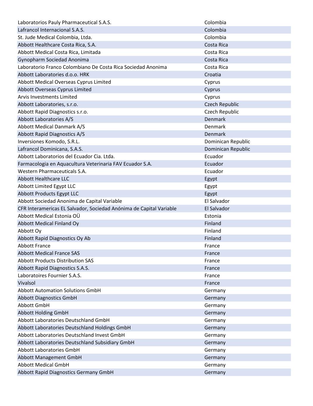Laboratorios Pauly Pharmaceutical S.A.S. Colombia Lafrancol Internacional S.A.S. Colombia St. Jude Medical Colombia, Ltda. Colombia Abbott Healthcare Costa Rica, S.A. Costa Rica Abbott Medical Costa Rica, Limitada Costa Rica Gynopharm Sociedad Anonima Costa Rica Laboratorio Franco Colombiano De Costa Rica Sociedad Anonima Costa Rica Abbott Laboratories d.o.o. HRK Croatia Abbott Medical Overseas Cyprus Limited Cyprus Abbott Overseas Cyprus Limited Cyprus Arvis Investments Limited Cyprus Abbott Laboratories, s.r.o. Czech Republic Abbott Rapid Diagnostics s.r.o. Czech Republic Abbott Laboratories A/S Denmark Abbott Medical Danmark A/S Denmark Abbott Rapid Diagnostics A/S Denmark Inversiones Komodo, S.R.L. Dominican Republic Lafrancol Dominicana, S.A.S. Dominican Republic Abbott Laboratorios del Ecuador Cia. Ltda. Ecuador Farmacologia en Aquacultura Veterinaria FAV Ecuador S.A. Ecuador Western Pharmaceuticals S.A. Ecuador Abbott Healthcare LLC Egypt Abbott Limited Egypt LLC Egypt Abbott Products Egypt LLC Egypt Abbott Sociedad Anonima de Capital Variable El Salvador CFR Interamericas EL Salvador, Sociedad Anónima de Capital Variable El Salvador Abbott Medical Estonia OÜ Estonia Abbott Medical Finland Oy Finland Abbott Oy Finland Abbott Rapid Diagnostics Oy Ab Finland Abbott France France Abbott Medical France SAS France Abbott Products Distribution SAS France Abbott Rapid Diagnostics S.A.S. France Laboratoires Fournier S.A.S. France Vivalsol France Abbott Automation Solutions GmbH Germany Abbott Diagnostics GmbH Germany Abbott GmbH Germany Abbott Holding GmbH Germany Abbott Laboratories Deutschland GmbH Germany Abbott Laboratories Deutschland Holdings GmbH Germany Abbott Laboratories Deutschland Invest GmbH Germany Abbott Laboratories Deutschland Subsidiary GmbH Germany Abbott Laboratories GmbH Germany Abbott Management GmbH Germany Abbott Medical GmbH Germany Abbott Rapid Diagnostics Germany GmbH Germany