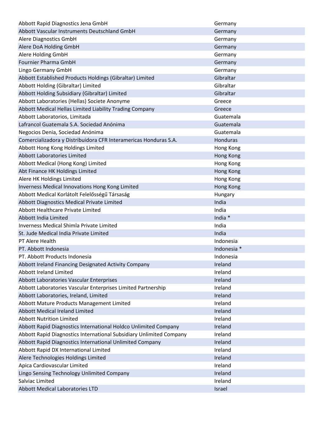 Abbott Rapid Diagnostics Jena GmbH Germany Abbott Vascular Instruments Deutschland GmbH Germany Alere Diagnostics GmbH Germany Alere DoA Holding GmbH Germany Alere Holding GmbH Germany Fournier Pharma GmbH Germany Lingo Germany GmbH Germany Abbott Established Products Holdings (Gibraltar) Limited Gibraltar Abbott Holding (Gibraltar) Limited Gibraltar Abbott Holding Subsidiary (Gibraltar) Limited Gibraltar Abbott Laboratories (Hellas) Societe Anonyme Greece Abbott Medical Hellas Limited Liability Trading Company Greece Abbott Laboratorios, Limitada Guatemala Lafrancol Guatemala S.A. Sociedad Anónima Guatemala Negocios Denia, Sociedad Anónima Guatemala Comercializadora y Distribuidora CFR Interamericas Honduras S.A. Honduras Abbott Hong Kong Holdings Limited Hong Kong Abbott Laboratories Limited Hong Kong Abbott Medical (Hong Kong) Limited Hong Kong Abt Finance HK Holdings Limited Hong Kong Alere HK Holdings Limited Hong Kong Inverness Medical Innovations Hong Kong Limited Hong Kong Abbott Medical Korlátolt Felelősségű Társaság Hungary Abbott Diagnostics Medical Private Limited India Abbott Healthcare Private Limited India Abbott India Limited India * Inverness Medical Shimla Private Limited India St. Jude Medical India Private Limited India PT Alere Health Indonesia PT. Abbott Indonesia Indonesia * PT. Abbott Products Indonesia Indonesia Abbott Ireland Financing Designated Activity Company Ireland Abbott Ireland Limited Ireland Abbott Laboratories Vascular Enterprises Ireland Abbott Laboratories Vascular Enterprises Limited Partnership Ireland Abbott Laboratories, Ireland, Limited Ireland Abbott Mature Products Management Limited Ireland Abbott Medical Ireland Limited Ireland Abbott Nutrition Limited Ireland Abbott Rapid Diagnostics International Holdco Unlimited Company Ireland Abbott Rapid Diagnostics International Subsidiary Unlimited Company Ireland Abbott Rapid Diagnostics International Unlimited Company Ireland Abbott Rapid DX International Limited Ireland Alere Technologies Holdings Limited Ireland Apica Cardiovascular Limited Ireland Lingo Sensing Technology Unlimited Company Ireland Salviac Limited Ireland Abbott Medical Laboratories LTD Israel