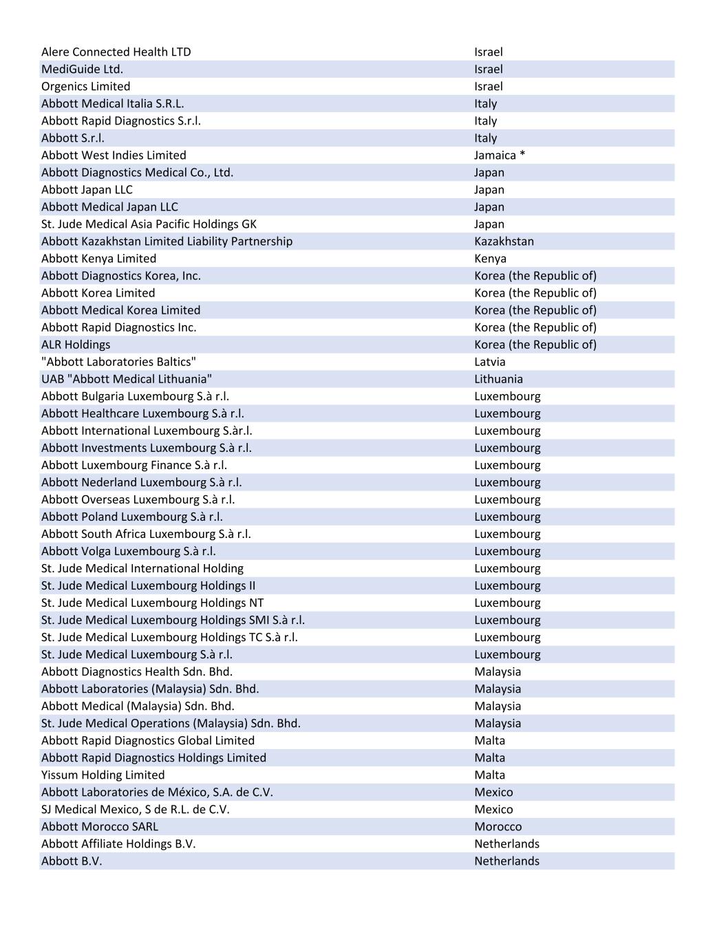 Alere Connected Health LTD Israel MediGuide Ltd. Israel Orgenics Limited Israel Abbott Medical Italia S.R.L. Italy Abbott Rapid Diagnostics S.r.l. Italy Abbott S.r.l. Italy Abbott West Indies Limited Jamaica * Abbott Diagnostics Medical Co., Ltd. Japan Abbott Japan LLC Japan Abbott Medical Japan LLC Japan St. Jude Medical Asia Pacific Holdings GK Japan Abbott Kazakhstan Limited Liability Partnership Kazakhstan Abbott Kenya Limited Kenya Abbott Diagnostics Korea, Inc. Korea (the Republic of) Abbott Korea Limited Korea (the Republic of) Abbott Medical Korea Limited Korea (the Republic of) Abbott Rapid Diagnostics Inc. Korea (the Republic of) ALR Holdings Korea (the Republic of) "Abbott Laboratories Baltics" Latvia UAB "Abbott Medical Lithuania" Lithuania Abbott Bulgaria Luxembourg S.à r.l. Luxembourg Abbott Healthcare Luxembourg S.à r.l. Luxembourg Abbott International Luxembourg S.àr.l. Luxembourg Abbott Investments Luxembourg S.à r.l. Luxembourg Abbott Luxembourg Finance S.à r.l. Luxembourg Abbott Nederland Luxembourg S.à r.l. Luxembourg Abbott Overseas Luxembourg S.à r.l. Luxembourg Abbott Poland Luxembourg S.à r.l. Luxembourg Abbott South Africa Luxembourg S.à r.l. Luxembourg Abbott Volga Luxembourg S.à r.l. Luxembourg St. Jude Medical International Holding Luxembourg St. Jude Medical Luxembourg Holdings II Luxembourg St. Jude Medical Luxembourg Holdings NT Luxembourg St. Jude Medical Luxembourg Holdings SMI S.à r.l. Luxembourg St. Jude Medical Luxembourg Holdings TC S.à r.l. Luxembourg St. Jude Medical Luxembourg S.à r.l. Luxembourg Abbott Diagnostics Health Sdn. Bhd. Malaysia Abbott Laboratories (Malaysia) Sdn. Bhd. Malaysia Abbott Medical (Malaysia) Sdn. Bhd. Malaysia St. Jude Medical Operations (Malaysia) Sdn. Bhd. Malaysia Abbott Rapid Diagnostics Global Limited Malta Abbott Rapid Diagnostics Holdings Limited Malta Yissum Holding Limited Malta Abbott Laboratories de México, S.A. de C.V. Mexico SJ Medical Mexico, S de R.L. de C.V. Mexico Abbott Morocco SARL Morocco Abbott Affiliate Holdings B.V. Netherlands Abbott B.V. Netherlands