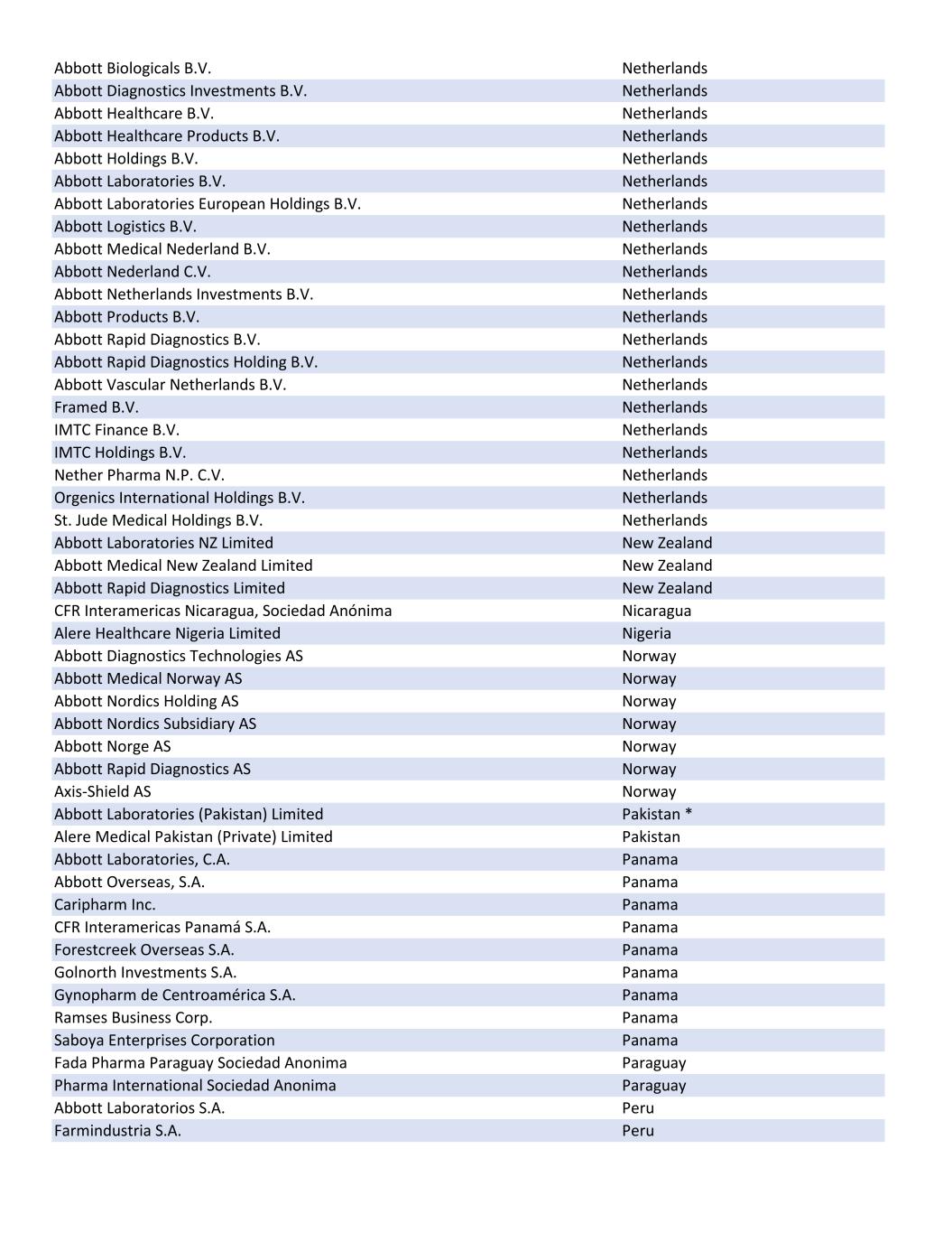 Abbott Biologicals B.V. Netherlands Abbott Diagnostics Investments B.V. Netherlands Abbott Healthcare B.V. Netherlands Abbott Healthcare Products B.V. Netherlands Abbott Holdings B.V. Netherlands Abbott Laboratories B.V. Netherlands Abbott Laboratories European Holdings B.V. Netherlands Abbott Logistics B.V. Netherlands Abbott Medical Nederland B.V. Netherlands Abbott Nederland C.V. Netherlands Abbott Netherlands Investments B.V. Netherlands Abbott Products B.V. Netherlands Abbott Rapid Diagnostics B.V. Netherlands Abbott Rapid Diagnostics Holding B.V. Netherlands Abbott Vascular Netherlands B.V. Netherlands Framed B.V. Netherlands IMTC Finance B.V. Netherlands IMTC Holdings B.V. Netherlands Nether Pharma N.P. C.V. Netherlands Orgenics International Holdings B.V. Netherlands St. Jude Medical Holdings B.V. Netherlands Abbott Laboratories NZ Limited New Zealand Abbott Medical New Zealand Limited New Zealand Abbott Rapid Diagnostics Limited New Zealand CFR Interamericas Nicaragua, Sociedad Anónima Nicaragua Alere Healthcare Nigeria Limited Nigeria Abbott Diagnostics Technologies AS Norway Abbott Medical Norway AS Norway Abbott Nordics Holding AS Norway Abbott Nordics Subsidiary AS Norway Abbott Norge AS Norway Abbott Rapid Diagnostics AS Norway Axis-Shield AS Norway Abbott Laboratories (Pakistan) Limited Pakistan * Alere Medical Pakistan (Private) Limited Pakistan Abbott Laboratories, C.A. Panama Abbott Overseas, S.A. Panama Caripharm Inc. Panama CFR Interamericas Panamá S.A. Panama Forestcreek Overseas S.A. Panama Golnorth Investments S.A. Panama Gynopharm de Centroamérica S.A. Panama Ramses Business Corp. Panama Saboya Enterprises Corporation Panama Fada Pharma Paraguay Sociedad Anonima Paraguay Pharma International Sociedad Anonima Paraguay Abbott Laboratorios S.A. Peru Farmindustria S.A. Peru