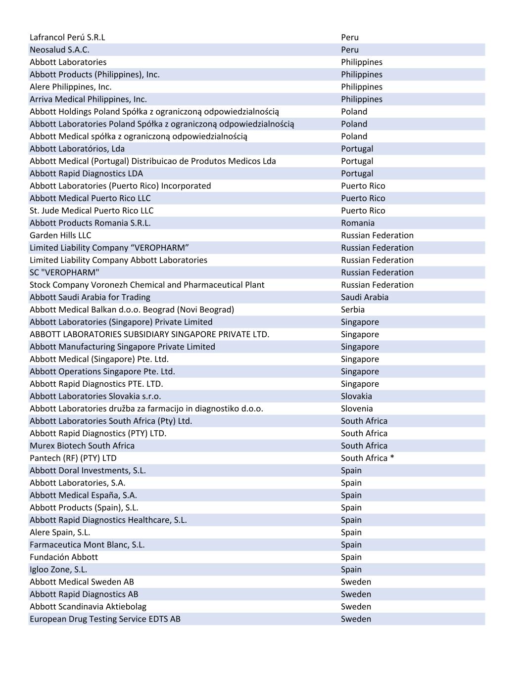 Lafrancol Perú S.R.L Peru Neosalud S.A.C. Peru Abbott Laboratories Philippines Abbott Products (Philippines), Inc. Philippines Alere Philippines, Inc. Philippines Arriva Medical Philippines, Inc. Philippines Abbott Holdings Poland Spółka z ograniczoną odpowiedzialnością Poland Abbott Laboratories Poland Spółka z ograniczoną odpowiedzialnością Poland Abbott Medical spółka z ograniczoną odpowiedzialnością Poland Abbott Laboratórios, Lda Portugal Abbott Medical (Portugal) Distribuicao de Produtos Medicos Lda Portugal Abbott Rapid Diagnostics LDA Portugal Abbott Laboratories (Puerto Rico) Incorporated Puerto Rico Abbott Medical Puerto Rico LLC Puerto Rico St. Jude Medical Puerto Rico LLC Puerto Rico Abbott Products Romania S.R.L. Romania Garden Hills LLC Russian Federation Limited Liability Company “VEROPHARM” Russian Federation Limited Liability Company Abbott Laboratories Russian Federation SC "VEROPHARM" Russian Federation Stock Company Voronezh Chemical and Pharmaceutical Plant Russian Federation Abbott Saudi Arabia for Trading Saudi Arabia Abbott Medical Balkan d.o.o. Beograd (Novi Beograd) Serbia Abbott Laboratories (Singapore) Private Limited Singapore ABBOTT LABORATORIES SUBSIDIARY SINGAPORE PRIVATE LTD. Singapore Abbott Manufacturing Singapore Private Limited Singapore Abbott Medical (Singapore) Pte. Ltd. Singapore Abbott Operations Singapore Pte. Ltd. Singapore Abbott Rapid Diagnostics PTE. LTD. Singapore Abbott Laboratories Slovakia s.r.o. Slovakia Abbott Laboratories družba za farmacijo in diagnostiko d.o.o. Slovenia Abbott Laboratories South Africa (Pty) Ltd. South Africa Abbott Rapid Diagnostics (PTY) LTD. South Africa Murex Biotech South Africa South Africa Pantech (RF) (PTY) LTD South Africa * Abbott Doral Investments, S.L. Spain Abbott Laboratories, S.A. Spain Abbott Medical España, S.A. Spain Abbott Products (Spain), S.L. Spain Abbott Rapid Diagnostics Healthcare, S.L. Spain Alere Spain, S.L. Spain Farmaceutica Mont Blanc, S.L. Spain Fundación Abbott Spain Igloo Zone, S.L. Spain Abbott Medical Sweden AB Sweden Abbott Rapid Diagnostics AB Sweden Abbott Scandinavia Aktiebolag Sweden European Drug Testing Service EDTS AB Sweden