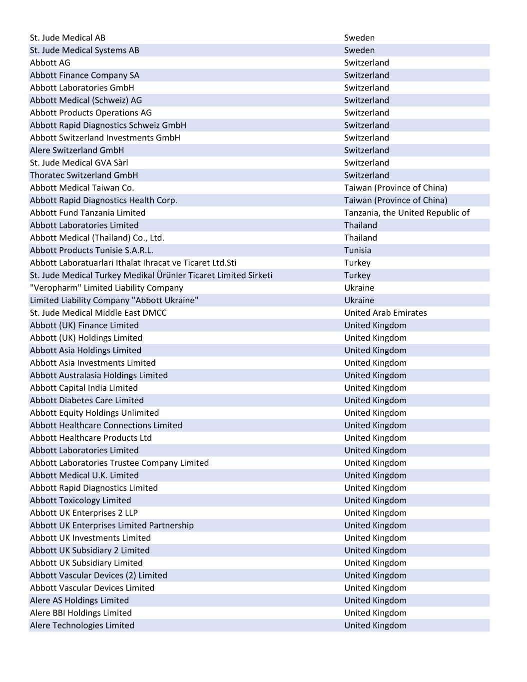 St. Jude Medical AB Sweden St. Jude Medical Systems AB Sweden Abbott AG Switzerland Abbott Finance Company SA Switzerland Abbott Laboratories GmbH Switzerland Abbott Medical (Schweiz) AG Switzerland Abbott Products Operations AG Switzerland Abbott Rapid Diagnostics Schweiz GmbH Switzerland Abbott Switzerland Investments GmbH Switzerland Alere Switzerland GmbH Switzerland St. Jude Medical GVA Sàrl Switzerland Thoratec Switzerland GmbH Switzerland Abbott Medical Taiwan Co. Taiwan (Province of China) Abbott Rapid Diagnostics Health Corp. Taiwan (Province of China) Abbott Fund Tanzania Limited Tanzania, the United Republic of Abbott Laboratories Limited Thailand Abbott Medical (Thailand) Co., Ltd. Thailand Abbott Products Tunisie S.A.R.L. Tunisia Abbott Laboratuarlari Ithalat Ihracat ve Ticaret Ltd.Sti Turkey St. Jude Medical Turkey Medikal Ürünler Ticaret Limited Sirketi Turkey "Veropharm" Limited Liability Company Ukraine Limited Liability Company "Abbott Ukraine" Ukraine St. Jude Medical Middle East DMCC United Arab Emirates Abbott (UK) Finance Limited United Kingdom Abbott (UK) Holdings Limited United Kingdom Abbott Asia Holdings Limited United Kingdom Abbott Asia Investments Limited United Kingdom Abbott Australasia Holdings Limited United Kingdom Abbott Capital India Limited United Kingdom Abbott Diabetes Care Limited United Kingdom Abbott Equity Holdings Unlimited United Kingdom Abbott Healthcare Connections Limited United Kingdom Abbott Healthcare Products Ltd United Kingdom Abbott Laboratories Limited United Kingdom Abbott Laboratories Trustee Company Limited United Kingdom Abbott Medical U.K. Limited United Kingdom Abbott Rapid Diagnostics Limited United Kingdom Abbott Toxicology Limited United Kingdom Abbott UK Enterprises 2 LLP United Kingdom Abbott UK Enterprises Limited Partnership United Kingdom Abbott UK Investments Limited United Kingdom Abbott UK Subsidiary 2 Limited United Kingdom Abbott UK Subsidiary Limited United Kingdom Abbott Vascular Devices (2) Limited United Kingdom Abbott Vascular Devices Limited United Kingdom Alere AS Holdings Limited United Kingdom Alere BBI Holdings Limited United Kingdom Alere Technologies Limited United Kingdom