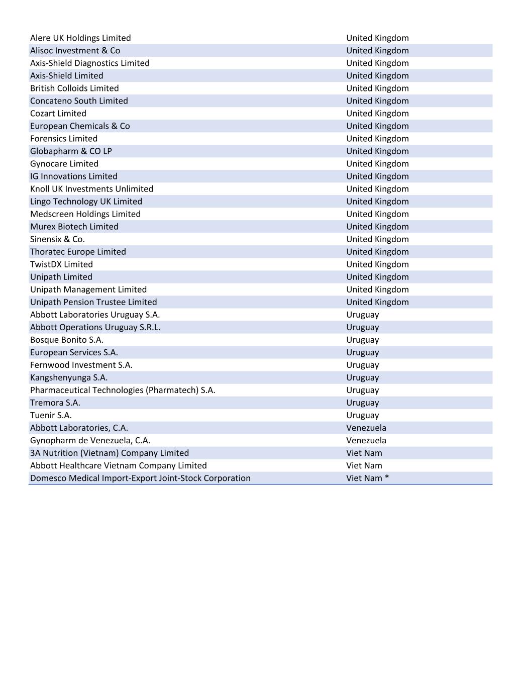 Alere UK Holdings Limited United Kingdom Alisoc Investment & Co United Kingdom Axis-Shield Diagnostics Limited United Kingdom Axis-Shield Limited United Kingdom British Colloids Limited United Kingdom Concateno South Limited United Kingdom Cozart Limited United Kingdom European Chemicals & Co United Kingdom Forensics Limited United Kingdom Globapharm & CO LP United Kingdom Gynocare Limited United Kingdom IG Innovations Limited United Kingdom Knoll UK Investments Unlimited United Kingdom Lingo Technology UK Limited United Kingdom Medscreen Holdings Limited United Kingdom Murex Biotech Limited United Kingdom Sinensix & Co. United Kingdom Thoratec Europe Limited United Kingdom TwistDX Limited United Kingdom Unipath Limited United Kingdom Unipath Management Limited United Kingdom Unipath Pension Trustee Limited United Kingdom Abbott Laboratories Uruguay S.A. Uruguay Abbott Operations Uruguay S.R.L. Uruguay Bosque Bonito S.A. Uruguay European Services S.A. Uruguay Fernwood Investment S.A. Uruguay Kangshenyunga S.A. Uruguay Pharmaceutical Technologies (Pharmatech) S.A. Uruguay Tremora S.A. Uruguay Tuenir S.A. Uruguay Abbott Laboratories, C.A. Venezuela Gynopharm de Venezuela, C.A. Venezuela 3A Nutrition (Vietnam) Company Limited Viet Nam Abbott Healthcare Vietnam Company Limited Viet Nam Domesco Medical Import-Export Joint-Stock Corporation Viet Nam *