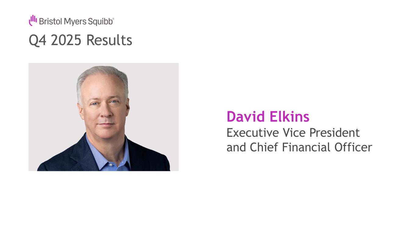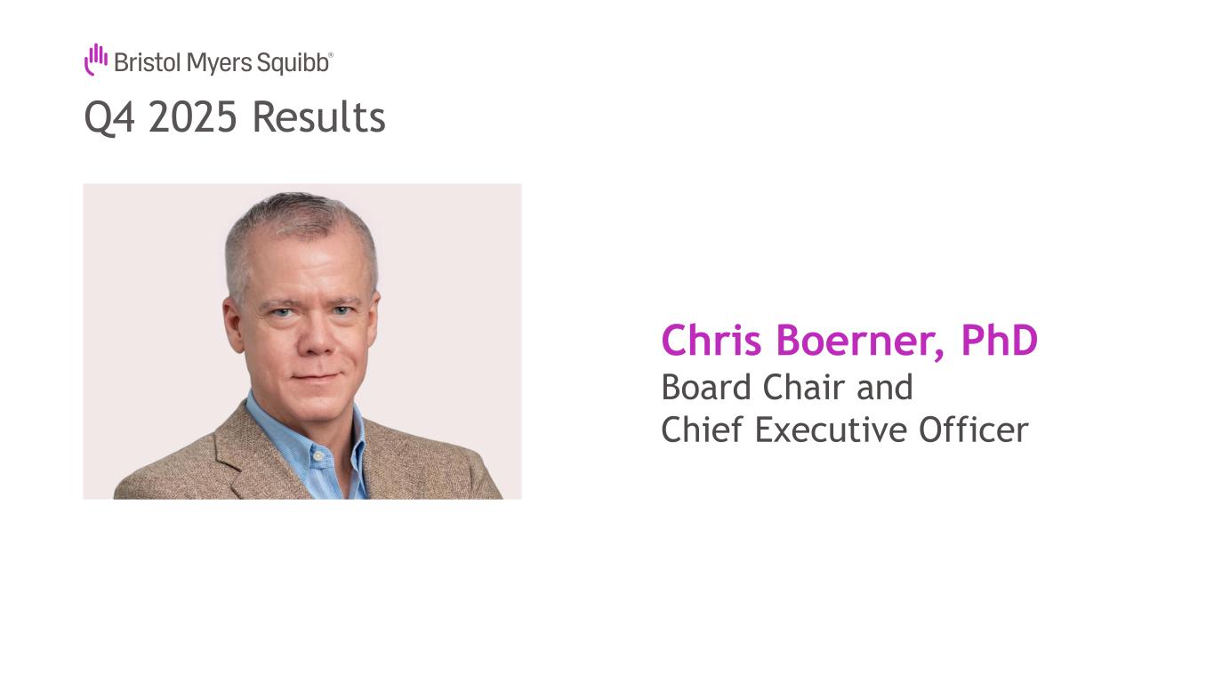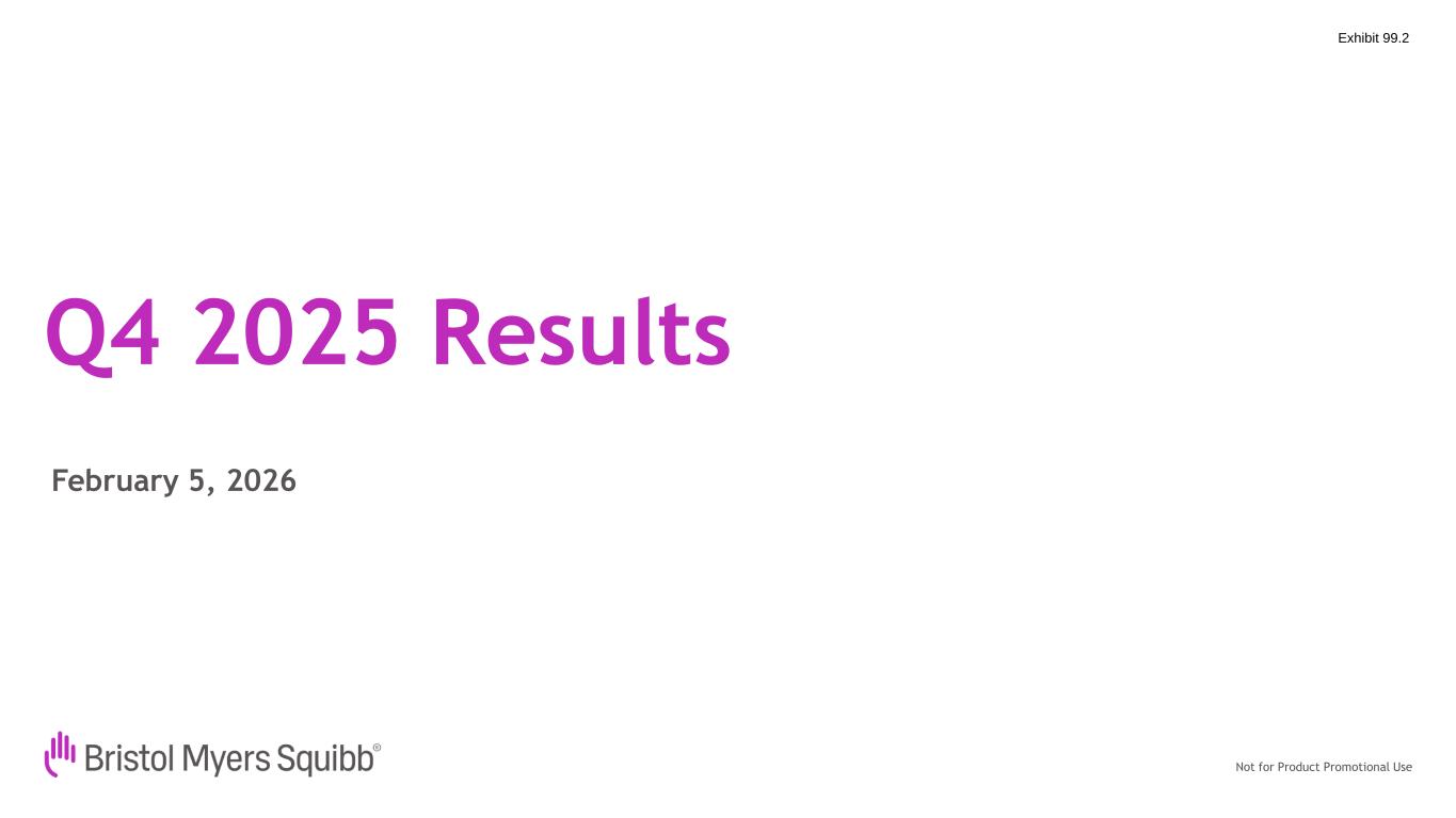 Not for Product Promotional UseQ4 2025 Results Forward Looking Statements and Non-GAAP Financial Information 2 This presentation contains statements about Bristol-Myers Squibb Company’s (the “Company”) future financial results, plans, business development strategy, anticipated clinical trials, results and regulatory approvals that constitute forward-looking statements for purposes of the safe harbor provisions under the Private Securities Litigation Reform Act of 1995. All statements that are not statements of historical facts are, or may be deemed to be, forward-looking statements. Actual results may differ materially from those expressed in, or implied by, these statements as a result of various factors, including, but not limited to: (i) new laws, government actions, agreements and regulations, including with respect to pricing controls and market access and the imposition of new tariffs, trade restrictions and export regulations, including the potential for international reference pricing and most-favored nation drug pricing for our products, (ii) our ability to obtain, protect and maintain market exclusivity rights and enforce patents and other intellectual property rights, (iii) our ability to achieve expected clinical, regulatory and contractual milestones on expected timelines or at all, (iv) difficulties or delays in the development and commercialization of new products, (v) difficulties or delays in our clinical trials and the manufacturing, distribution and sale of our products, (vi) adverse outcomes in legal or regulatory proceedings, (vii) risks relating to acquisitions, divestitures, alliances, joint ventures and other portfolio actions and (viii) political and financial instability, including changes in general economic conditions. These and other important factors are discussed in the Company’s most recent annual report on Form 10-K and reports on Forms 10-Q and 8-K. These documents are available on the U.S. Securities and Exchange Commission’s website, on the Company’s website or from Bristol-Myers Squibb Investor Relations. No forward- looking statements can be guaranteed. In addition, any forward-looking statements and clinical data included herein are presented only as of the date hereof. Except as otherwise required by applicable law, the Company undertakes no obligation to publicly update any of the provided information, whether as a result of new information, future events, changed circumstances or otherwise. This presentation includes certain non-generally accepted accounting principles (“GAAP”) financial measures that we use to describe the Company’s performance. The non-GAAP financial measures are provided as supplemental information and are presented because management has evaluated the Company’s financial results both including and excluding the adjusted items or the effects of foreign currency translation, as applicable, and believes that the non-GAAP financial measures presented portray the results of the Company’s baseline performance, supplement or enhance management’s, analysts’ and investors’ overall understanding of the Company’s underlying financial performance and trends and facilitate comparisons among current, past and future periods. This presentation also provides certain revenues and expenses excluding the impact of foreign exchange (“Ex- FX”). We calculate foreign exchange impacts by converting our current-period local currency financial results using the prior period average currency rates and comparing these adjusted amounts to our current-period results. Ex-FX financial measures are not accounted for according to GAAP because they remove the effects of currency movements from GAAP results. The non-GAAP information presented herein provides investors with additional useful information but should not be considered in isolation or as substitutes for the related GAAP measures. Moreover, other companies may define non-GAAP measures differently, which limits the usefulness of these measures for comparisons with such other companies. We encourage investors to review our financial statements and publicly filed reports in their entirety and not to rely on any single financial measure. An explanation of these non-GAAP financial measures and a reconciliation to the most directly comparable financial measure are available on our website at www.bms.com/investors. Also note that a reconciliation of forward-looking non-GAAP measures, including non-GAAP earnings per share (EPS), to the most directly comparable GAAP measures is not provided because comparable GAAP measures for such measures are not reasonably accessible or reliable due to the inherent difficulty in forecasting and quantifying measures that would be necessary for such reconciliation. Namely, we are not, without unreasonable effort, able to reliably predict the impact of accelerated depreciation and impairment charges, legal and other settlements, gains and losses from equity investments and other adjustments. In addition, the Company believes such a reconciliation would imply a degree of precision and certainty that could be confusing to investors. These items are uncertain, depend on various factors and may have a material impact on our future GAAP results. Certain information presented in the accompanying presentation may not add due to the use of rounded numbers.