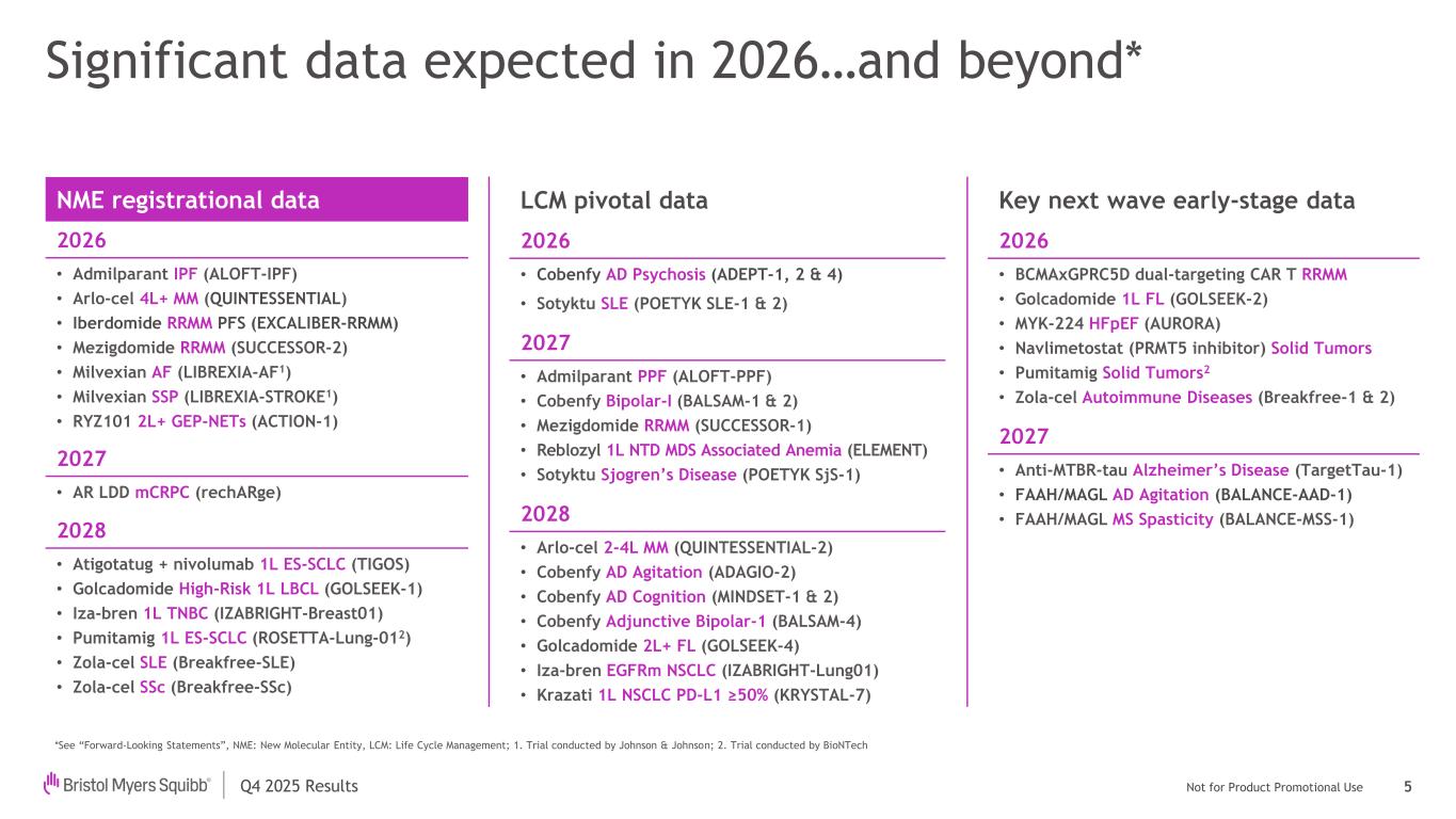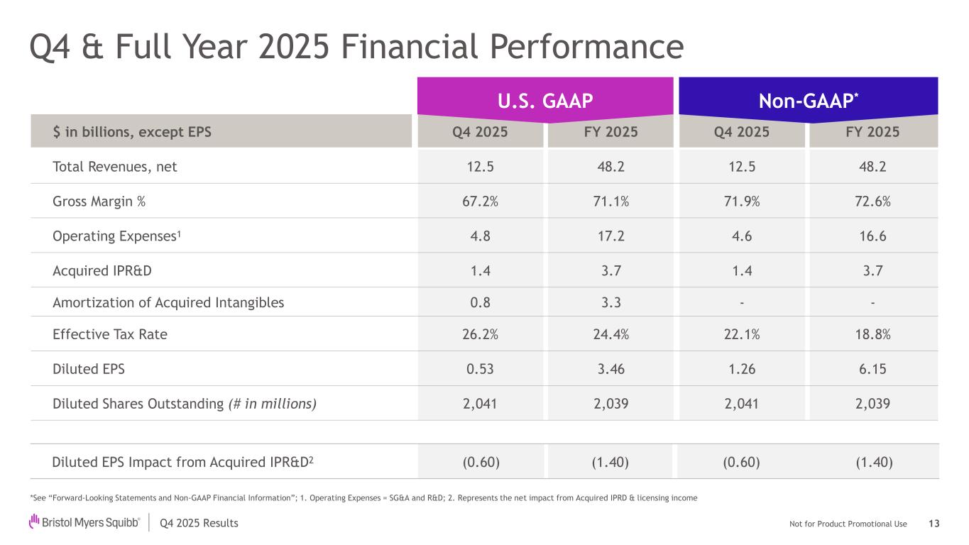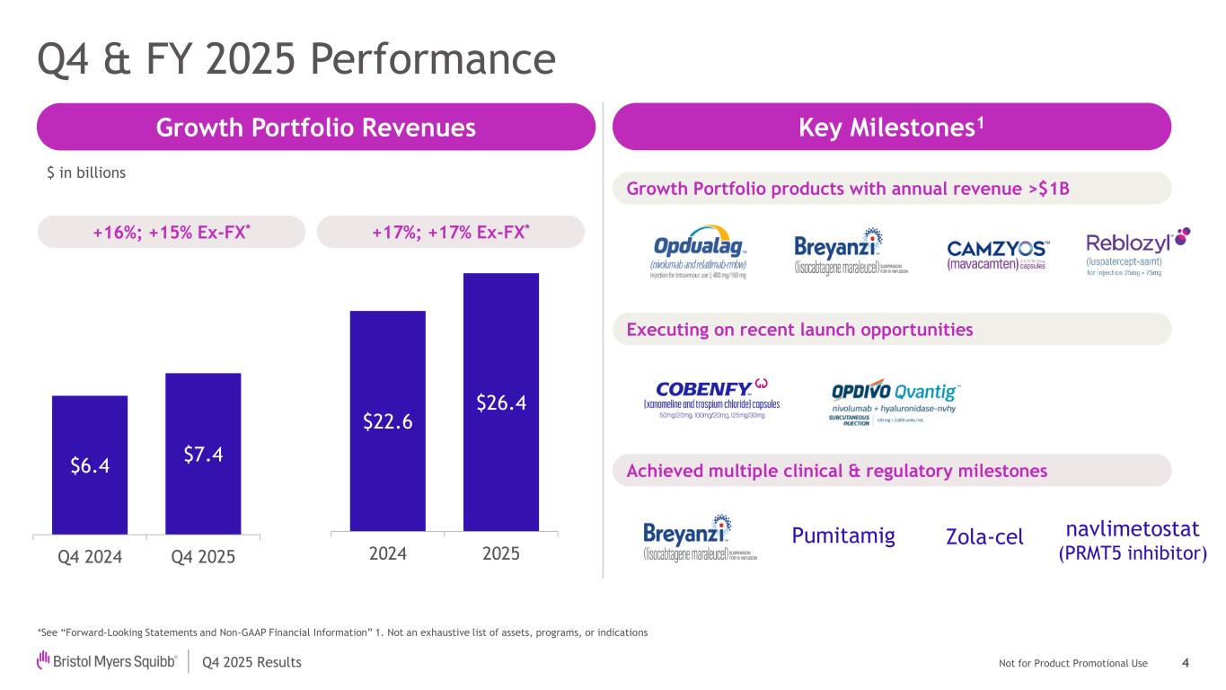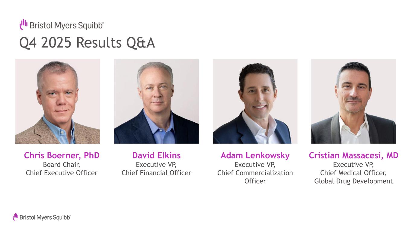 Not for Product Promotional UseQ4 2025 Results Forward Looking Statements and Non-GAAP Financial Information 2 This presentation contains statements about Bristol-Myers Squibb Company’s (the “Company”) future financial results, plans, business development strategy, anticipated clinical trials, results and regulatory approvals that constitute forward-looking statements for purposes of the safe harbor provisions under the Private Securities Litigation Reform Act of 1995. All statements that are not statements of historical facts are, or may be deemed to be, forward-looking statements. Actual results may differ materially from those expressed in, or implied by, these statements as a result of various factors, including, but not limited to: (i) new laws, government actions, agreements and regulations, including with respect to pricing controls and market access and the imposition of new tariffs, trade restrictions and export regulations, including the potential for international reference pricing and most-favored nation drug pricing for our products, (ii) our ability to obtain, protect and maintain market exclusivity rights and enforce patents and other intellectual property rights, (iii) our ability to achieve expected clinical, regulatory and contractual milestones on expected timelines or at all, (iv) difficulties or delays in the development and commercialization of new products, (v) difficulties or delays in our clinical trials and the manufacturing, distribution and sale of our products, (vi) adverse outcomes in legal or regulatory proceedings, (vii) risks relating to acquisitions, divestitures, alliances, joint ventures and other portfolio actions and (viii) political and financial instability, including changes in general economic conditions. These and other important factors are discussed in the Company’s most recent annual report on Form 10-K and reports on Forms 10-Q and 8-K. These documents are available on the U.S. Securities and Exchange Commission’s website, on the Company’s website or from Bristol-Myers Squibb Investor Relations. No forward- looking statements can be guaranteed. In addition, any forward-looking statements and clinical data included herein are presented only as of the date hereof. Except as otherwise required by applicable law, the Company undertakes no obligation to publicly update any of the provided information, whether as a result of new information, future events, changed circumstances or otherwise. This presentation includes certain non-generally accepted accounting principles (“GAAP”) financial measures that we use to describe the Company’s performance. The non-GAAP financial measures are provided as supplemental information and are presented because management has evaluated the Company’s financial results both including and excluding the adjusted items or the effects of foreign currency translation, as applicable, and believes that the non-GAAP financial measures presented portray the results of the Company’s baseline performance, supplement or enhance management’s, analysts’ and investors’ overall understanding of the Company’s underlying financial performance and trends and facilitate comparisons among current, past and future periods. This presentation also provides certain revenues and expenses excluding the impact of foreign exchange (“Ex- FX”). We calculate foreign exchange impacts by converting our current-period local currency financial results using the prior period average currency rates and comparing these adjusted amounts to our current-period results. Ex-FX financial measures are not accounted for according to GAAP because they remove the effects of currency movements from GAAP results. The non-GAAP information presented herein provides investors with additional useful information but should not be considered in isolation or as substitutes for the related GAAP measures. Moreover, other companies may define non-GAAP measures differently, which limits the usefulness of these measures for comparisons with such other companies. We encourage investors to review our financial statements and publicly filed reports in their entirety and not to rely on any single financial measure. An explanation of these non-GAAP financial measures and a reconciliation to the most directly comparable financial measure are available on our website at www.bms.com/investors. Also note that a reconciliation of forward-looking non-GAAP measures, including non-GAAP earnings per share (EPS), to the most directly comparable GAAP measures is not provided because comparable GAAP measures for such measures are not reasonably accessible or reliable due to the inherent difficulty in forecasting and quantifying measures that would be necessary for such reconciliation. Namely, we are not, without unreasonable effort, able to reliably predict the impact of accelerated depreciation and impairment charges, legal and other settlements, gains and losses from equity investments and other adjustments. In addition, the Company believes such a reconciliation would imply a degree of precision and certainty that could be confusing to investors. These items are uncertain, depend on various factors and may have a material impact on our future GAAP results. Certain information presented in the accompanying presentation may not add due to the use of rounded numbers.