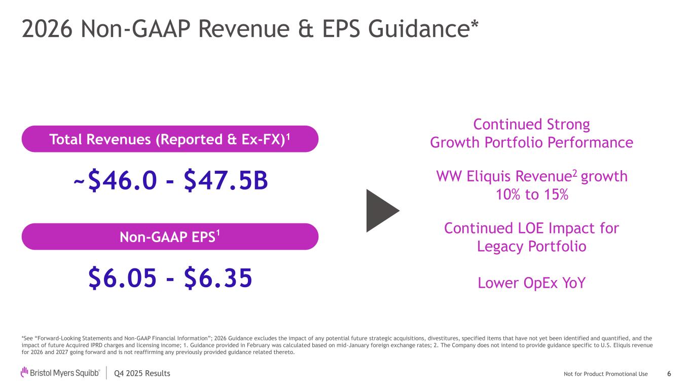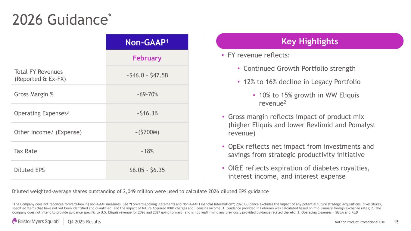 Not for Product Promotional UseQ4 2025 Results 2026 Guidance* 15 *The Company does not reconcile forward-looking non-GAAP measures. See “Forward-Looking Statements and Non-GAAP Financial Information”; 2026 Guidance excludes the impact of any potential future strategic acquisitions, divestitures, specified items that have not yet been identified and quantified, and the impact of future Acquired IPRD charges and licensing income; 1. Guidance provided in February was calculated based on mid-January foreign exchange rates; 2. The Company does not intend to provide guidance specific to U.S. Eliquis revenue for 2026 and 2027 going forward, and is not reaffirming any previously provided guidance related thereto; 3. Operating Expenses = SG&A and R&D Non-GAAP1 February Total FY Revenues (Reported & Ex-FX) ~$46.0 - $47.5B Gross Margin % ~69-70% Operating Expenses3 ~$16.3B Other Income/ (Expense) ~($700M) Tax Rate ~18% Diluted EPS $6.05 - $6.35 • FY revenue reflects: • Continued Growth Portfolio strength • 12% to 16% decline in Legacy Portfolio • 10% to 15% growth in WW Eliquis revenue2 • Gross margin reflects impact of product mix (higher Eliquis and lower Revlimid and Pomalyst revenue) • OpEx reflects net impact from investments and savings from strategic productivity initiative • OI&E reflects expiration of diabetes royalties, interest income, and interest expense Diluted weighted-average shares outstanding of 2,049 million were used to calculate 2026 diluted EPS guidance Key Highlights