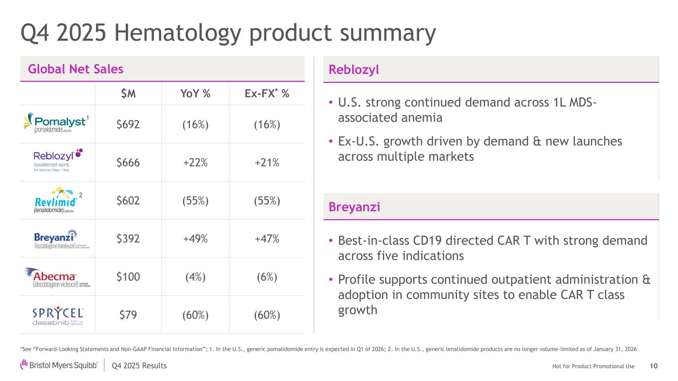 Not for Product Promotional UseQ4 2025 Results Q4 2025 Oncology product summary *See “Forward-Looking Statements and Non-GAAP Financial Information”; 1. Abraxane: Q4 2025 WW Sales $84M - YoY% (52%), (52%) Ex-FX* Global Net Sales1 $M YoY % Ex-FX* % $2,693 +9% +7% $810 +20% +18% $350 +38% +37% $133 --- --- $55 +41% +41% Opdivo • Performance reflects recent launches in MSI-high CRC, HCC & 1L NSCLC strength Opdualag • U.S. sales growth driven by continued demand as a standard of care in 1L melanoma • Ex-U.S. growth from new EU launches Qvantig • Increasing adoption from patients & providers across indicated tumor types • Uptake progressing as expected 9