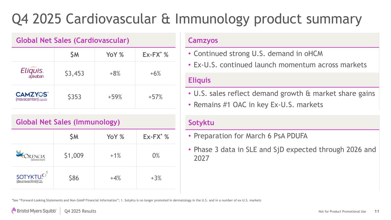Not for Product Promotional UseQ4 2025 Results Global Net Sales $M YoY % Ex-FX* % $692 (16%) (16%) $666 +22% +21% $602 (55%) (55%) $392 +49% +47% $100 (4%) (6%) $79 (60%) (60%) Q4 2025 Hematology product summary *See “Forward-Looking Statements and Non-GAAP Financial Information”; 1. In the U.S., generic pomalidomide entry is expected in Q1 of 2026; 2. In the U.S., generic lenalidomide products are no longer volume-limited as of January 31, 2026 1 Reblozyl • U.S. strong continued demand across 1L MDS- associated anemia • Ex-U.S. growth driven by demand & new launches across multiple markets Breyanzi • Best-in-class CD19 directed CAR T with strong demand across five indications • Profile supports continued outpatient administration & adoption in community sites to enable CAR T class growth 10 2