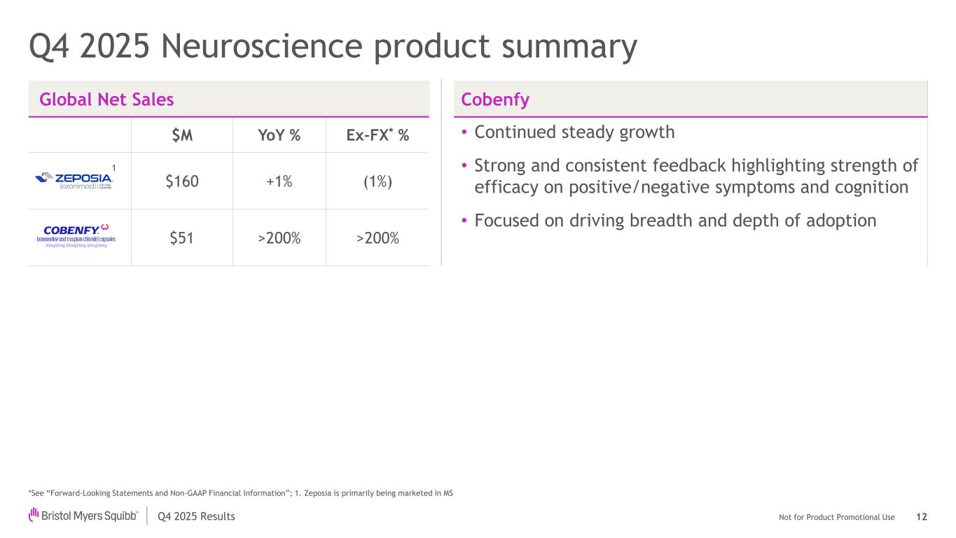 Not for Product Promotional UseQ4 2025 Results Q4 2025 Cardiovascular & Immunology product summary Global Net Sales (Cardiovascular) $M YoY % Ex-FX* % $3,453 +8% +6% $353 +59% +57% *See “Forward-Looking Statements and Non-GAAP Financial Information”; 1. Sotyktu is no longer promoted in dermatology in the U.S. and in a number of ex-U.S. markets Eliquis • U.S. sales reflect demand growth & market share gains • Remains #1 OAC in key Ex-U.S. markets Camzyos • Continued strong U.S. demand in oHCM • Ex-U.S. continued launch momentum across markets 11 Global Net Sales (Immunology) $M YoY % Ex-FX* % $1,009 +1% 0% $86 +4% +3% Sotyktu • Preparation for March 6 PsA PDUFA • Phase 3 data in SLE and SjD expected through 2026 and 2027 1