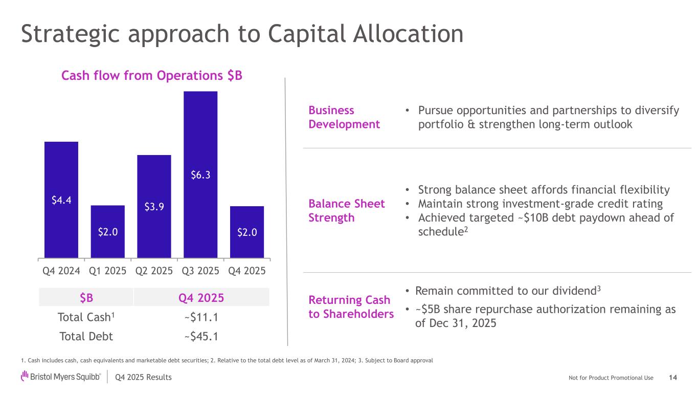 Not for Product Promotional UseQ4 2025 Results US GAAP Non-GAAP $ in billions, except EPS Q4 2025 FY 2025 Q4 2025 FY 2025 Total Revenues, net 12.5 48.2 12.5 48.2 Gross Margin % 67.2% 71.1% 71.9% 72.6% Operating Expenses1 4.8 17.2 4.6 16.6 Acquired IPR&D 1.4 3.7 1.4 3.7 Amortization of Acquired Intangibles 0.8 3.3 - - Effective Tax Rate 26.2% 24.4% 22.1% 18.8% Diluted EPS 0.53 3.46 1.26 6.15 Diluted Shares Outstanding (# in millions) 2,041 2,039 2,041 2,039 Q4 & Full Year 2025 Financial Performance U.S. G AP Non- P* Diluted EPS Impact from Acquired IPR&D2 (0.60) (1.40) (0.60) (1.40) *See “Forward-Looking Statements and Non-GAAP Financial Information”; 1. Operating Expenses = SG&A and R&D; 2. Represents the net impact from Acquired IPRD & licensing income 13