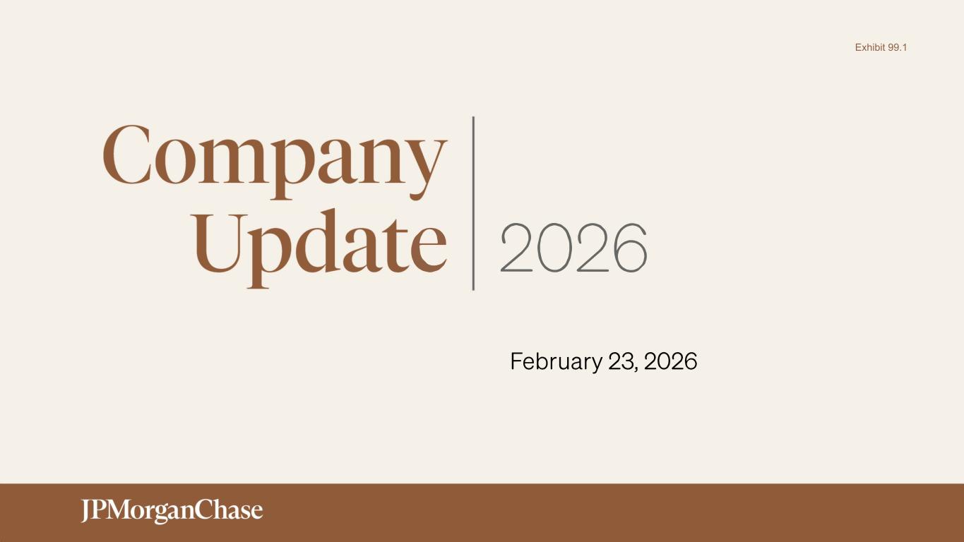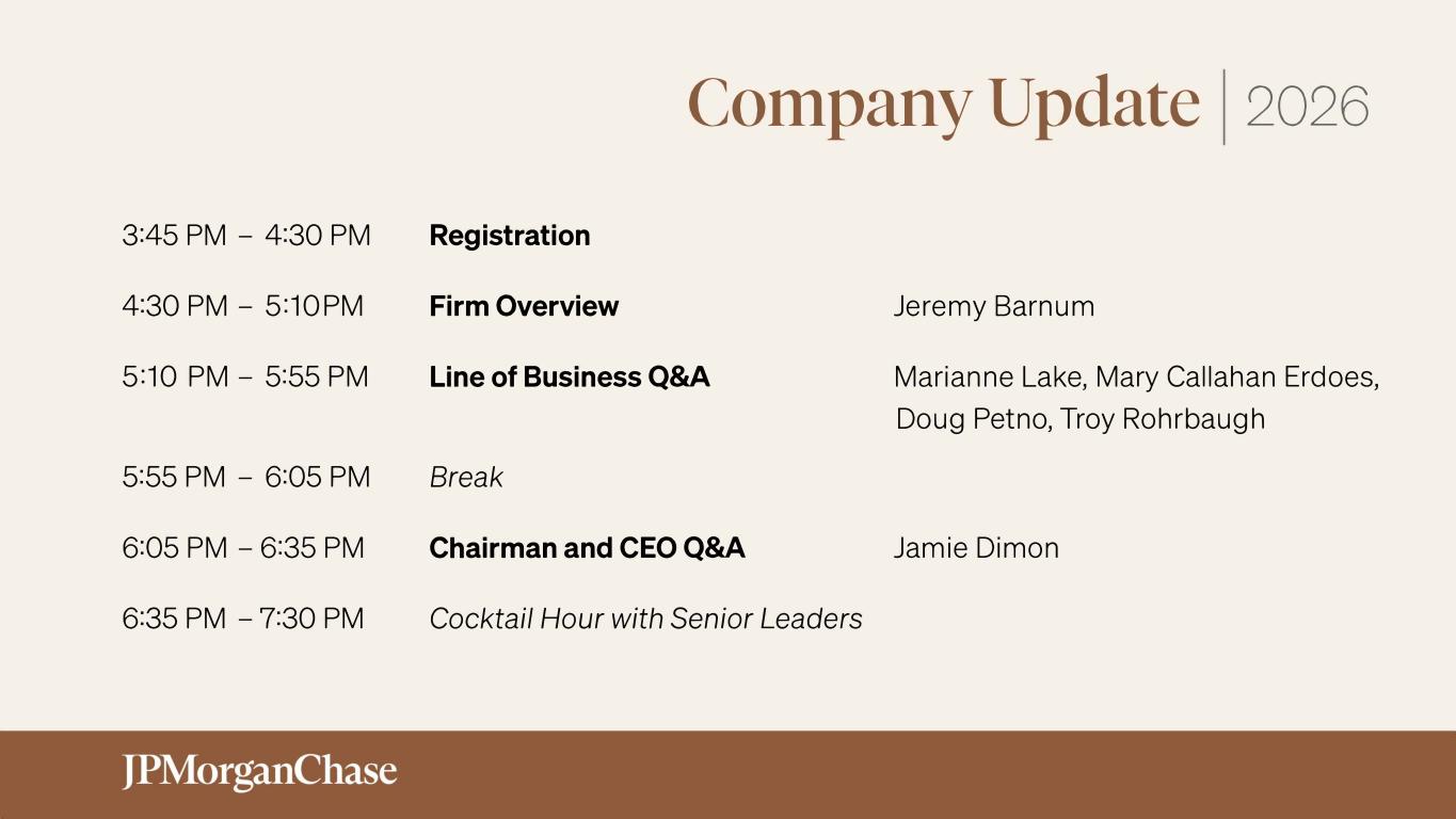 Company Update 2026 3:45 PM - 4:30 PM 4:30 PM - 5:10PM 5:10 PM - 5:55 PM Registration Firm Overview Line of Business Q&A 5:55 PM - 6:05 PM Break 6:05 PM - 6:35 PM 6:35 PM - 7:30 PM Chairman and CEO Q&A Cocktail Hour with Senior Leaders Jeremy Barnum Marianne Lake, Mary Callahan Erdoes, Doug Petno, Troy Rohrbaugh Jamie Dimon