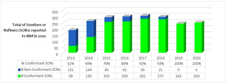 IBM’s progress in this area since 2013 is illustrated below and reflects that, in 2020, all SORs reported in the IBM supply chain are pursuing or are accredited as conformant to a recognized third-party validation scheme (or operating as refiners of recycled 3TG).