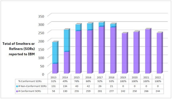 IBM’s progress in this area since 2013 is illustrated below and reflects that, at year-end 2022, for the fourth consecutive period, all SORs reported in the IBM supply chain are pursuing or are accredited as conformant to a recognized third-party validation scheme (or operating as refiners of 100% recycled 3TG).
