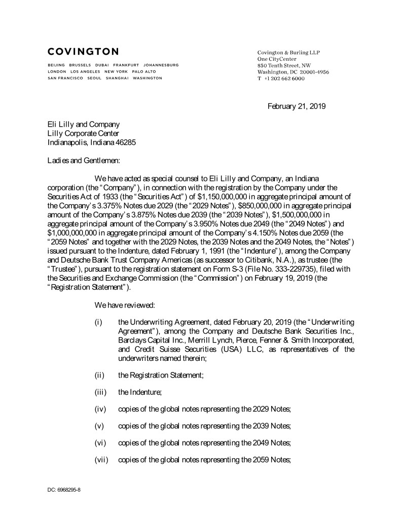 February 21, 2019 Eli Lilly and Company Lilly Corporate Center Indianapolis, Indiana 46285 Ladies and Gentlemen: We have acted as special counsel to Eli Lilly and Company, an Indiana corporation (the “Company”), in connection with the registration by the Company under the Securities Act of 1933 (the “Securities Act”) of $1,150,000,000 in aggregate principal amount of the Company’s 3.375% Notes due 2029 (the “2029 Notes”), $850,000,000 in aggregate principal amount of the Company’s 3.875% Notes due 2039 (the “2039 Notes”), $1,500,000,000 in aggregate principal amount of the Company’s 3.950% Notes due 2049 (the “2049 Notes”) and $1,000,000,000 in aggregate principal amount of the Company’s 4.150% Notes due 2059 (the “2059 Notes” and together with the 2029 Notes, the 2039 Notes and the 2049 Notes, the “Notes”) issued pursuant to the Indenture, dated February 1, 1991 (the “Indenture”), among the Company and Deutsche Bank Trust Company Americas (as successor to Citibank, N.A.), as trustee (the “Trustee”), pursuant to the registration statement on Form S-3 (File No. 333-229735), filed with the Securities and Exchange Commission (the “Commission”) on February 19, 2019 (the “Registration Statement”). We have reviewed: (i) the Underwriting Agreement, dated February 20, 2019 (the “Underwriting Agreement”), among the Company and Deutsche Bank Securities Inc., Barclays Capital Inc., Merrill Lynch, Pierce, Fenner & Smith Incorporated, and Credit Suisse Securities (USA) LLC, as representatives of the underwriters named therein; (ii) the Registration Statement; (iii) the Indenture; (iv) copies of the global notes representing the 2029 Notes; (v) copies of the global notes representing the 2039 Notes; (vi) copies of the global notes representing the 2049 Notes; (vii) copies of the global notes representing the 2059 Notes; DC: 6968295-8