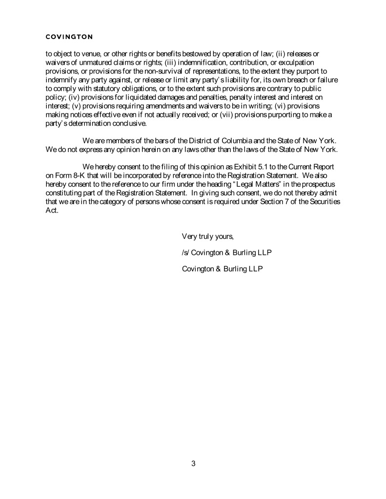 to object to venue, or other rights or benefits bestowed by operation of law; (ii) releases or waivers of unmatured claims or rights; (iii) indemnification, contribution, or exculpation provisions, or provisions for the non-survival of representations, to the extent they purport to indemnify any party against, or release or limit any party’s liability for, its own breach or failure to comply with statutory obligations, or to the extent such provisions are contrary to public policy; (iv) provisions for liquidated damages and penalties, penalty interest and interest on interest; (v) provisions requiring amendments and waivers to be in writing; (vi) provisions making notices effective even if not actually received; or (vii) provisions purporting to make a party’s determination conclusive. We are members of the bars of the District of Columbia and the State of New York. We do not express any opinion herein on any laws other than the laws of the State of New York. We hereby consent to the filing of this opinion as Exhibit 5.1 to the Current Report on Form 8-K that will be incorporated by reference into the Registration Statement. We also hereby consent to the reference to our firm under the heading “Legal Matters” in the prospectus constituting part of the Registration Statement. In giving such consent, we do not thereby admit that we are in the category of persons whose consent is required under Section 7 of the Securities Act. Very truly yours, /s/ Covington & Burling LLP Covington & Burling LLP 3