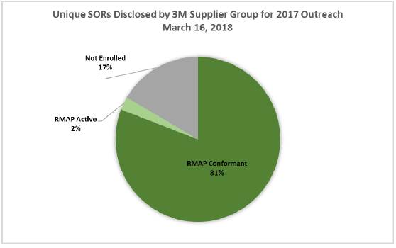 active by RMI, meaning they are engaged in the RMAP program but not yet conformant as of March 16, 2018. 3Ms Supplier Group identified 95% of the total number of conformant SORs listed on RMIs website in their supply chains. Based on our involvement in the RMI Due Diligence practices team and the RMI Smelter Engagement Team as well as resources available to us through our membership in RMI, 3M believes the number of SORs conformant to RMAP process is attributable in part to industry collaborative efforts through RMI and other third-party validation programs.