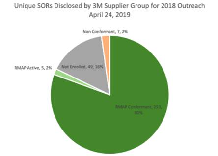 · Continued escalation of identified red-flagged SORs/SORs that are not RMAP conformant and consistent with OECD guidance to mitigate supply chain risk. As of April 24, 2019, 3M is continuing its due diligence efforts to mitigate supply chain risk with the remaining three suppliers that have reported to 3M that one or more of these SORs are in their respective supply chains.
