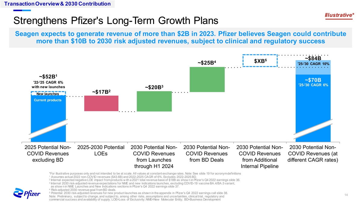 Transaction Overview & 2030 Contribution Transaction Overview • $229 per share; 100% cash consideration Purchase • Transaction value of approximately $43 billion (inclusive of net debt) Price • Premium of 33% to the 3/10/23 closing price and 42% premium to the unaffected closing price on 2/24/23 (3) rd th • Expected to be neutral to slightly accretive to adjusted diluted EPS in the 3 – 4 full year post-close • Expected to enhance Pfizer’s top-line growth immediately post-close and bottom-line growth profile in the long-term Financial rd Impact • Nearly $1 billion in cost efficiencies anticipated in the 3 full year post-close • Expected to enhance Pfizer’s long-term shareholder returns • No financing condition – expect to finance significant majority with ~$31 billion in long-term debt to be issued pre-close, with Funding and remainder from existing balance sheet cash and short-term financing* Capital • Committed to a high investment grade / tier-1 commercial paper rating Impact • Maintaining the financial flexibility for potential dividend increases and share repurchases Approvals • Closing subject to customary conditions, including receipt of required regulatory approvals and the approval by a majority of Seagen outstanding common shares and • Closing expected in late 2023 or in early 2024 Timing Note: Expected financial impacts above are based on non-GAAP amounts. See explanation on Slide 19 *Our financing plan for Seagen does not involve monetizing any portion of our Haleon stake. There is no change in our intention to approach monetization of our Haleon stake in a disciplined manner w ith a focus on maximizing shareholder value. 13