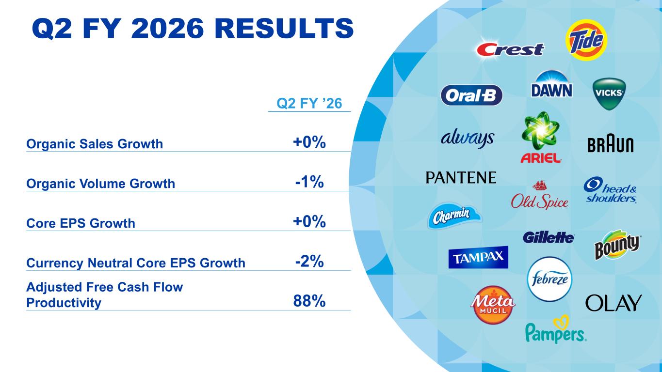 Q2 FY ’26 Organic Sales Growth +0% Organic Volume Growth -1% Core EPS Growth +0% Currency Neutral Core EPS Growth -2% Adjusted Free Cash Flow Productivity 88% Q2 FY 2026 RESULTS