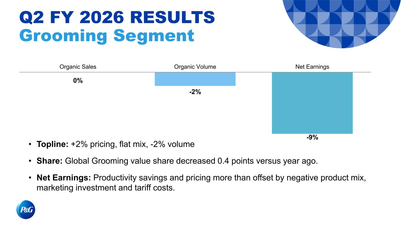 0% -2% -9% Organic Sales Organic Volume Net Earnings • Topline: +2% pricing, flat mix, -2% volume • Share: Global Grooming value share decreased 0.4 points versus year ago. • Net Earnings: Productivity savings and pricing more than offset by negative product mix, marketing investment and tariff costs. Q2 FY 2026 RESULTS Grooming Segment