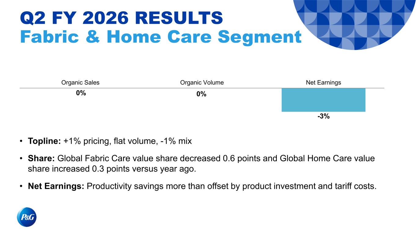 3% -1% 2% Organic Sales Organic Volume Net Earnings Q2 FY 2026 RESULTS Health Care Segment • Topline: +2% mix, +1% pricing, -1% volume • Share: Global Oral Care value share was flat and Global Personal Health Care value share increased 0.4 points versus year ago. • Net Earnings: Sales growth and productivity savings partially offset by negative geographic mix, increased marketing and tariff costs.
