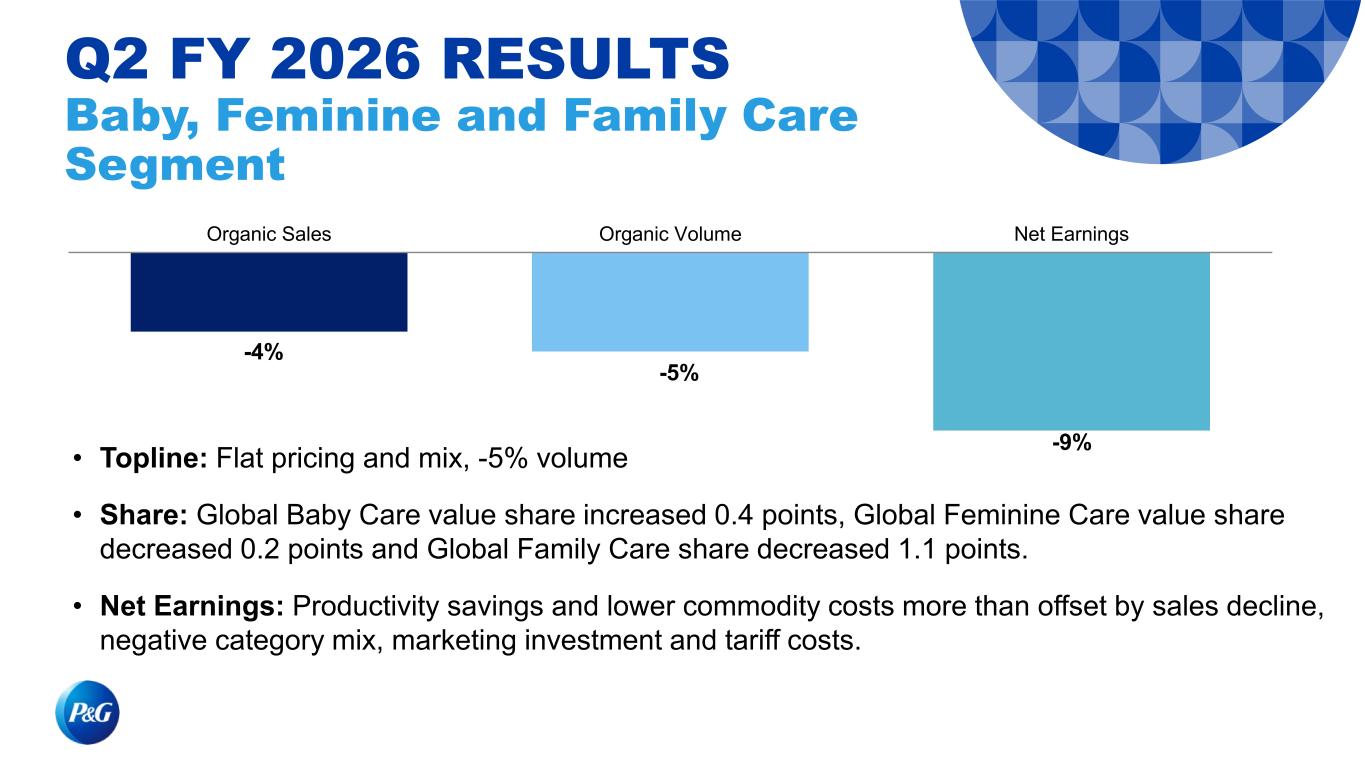 -4% -5% -9% Organic Sales Organic Volume Net Earnings • Topline: Flat pricing and mix, -5% volume • Share: Global Baby Care value share increased 0.4 points, Global Feminine Care value share decreased 0.2 points and Global Family Care share decreased 1.1 points. • Net Earnings: Productivity savings and lower commodity costs more than offset by sales decline, negative category mix, marketing investment and tariff costs. Q2 FY 2026 RESULTS Baby, Feminine and Family Care Segment