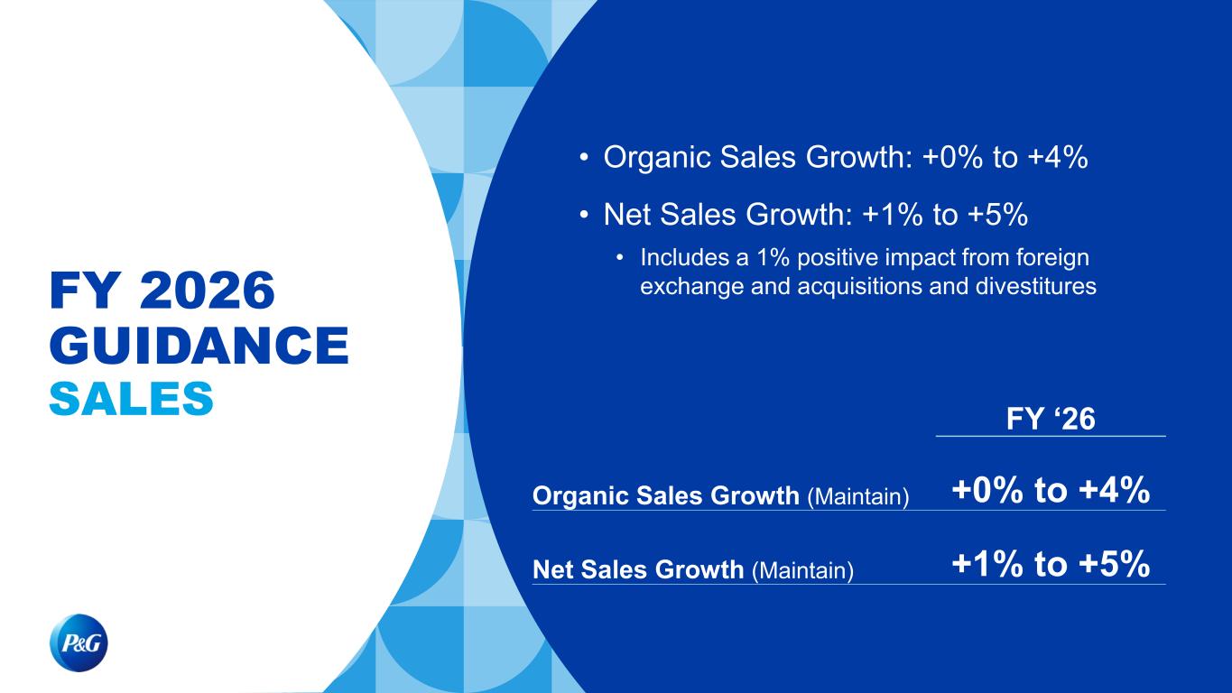 • Organic Sales Growth: +0% to +4% • Net Sales Growth: +1% to +5% • Includes a 1% positive impact from foreign exchange and acquisitions and divestitures FY ‘26 Organic Sales Growth (Maintain) +0% to +4% Net Sales Growth (Maintain) +1% to +5% FY 2026 GUIDANCE SALES