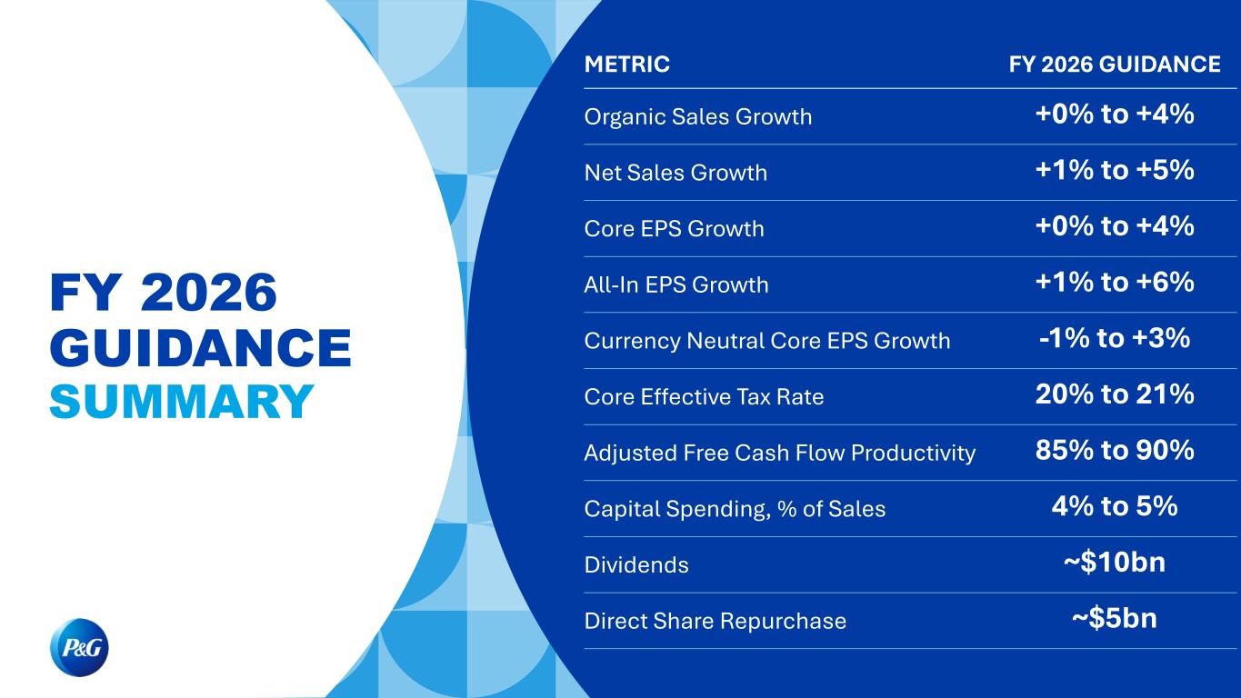 FY 2026 GUIDANCE SUMMARY METRIC FY 2026 GUIDANCE Organic Sales Growth +0% to +4% Net Sales Growth +1% to +5% Core EPS Growth +0% to +4% All-In EPS Growth +1% to +6% Currency Neutral Core EPS Growth -1% to +3% Core Effective Tax Rate 20% to 21% Adjusted Free Cash Flow Productivity 85% to 90% Capital Spending, % of Sales 4% to 5% Dividends ~$10bn Direct Share Repurchase ~$5bn
