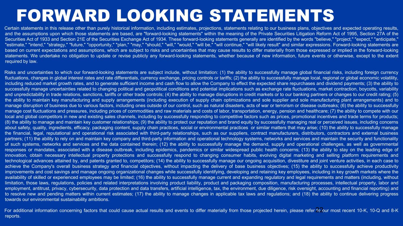 Certain statements in this release other than purely historical information, including estimates, projections, statements relating to our business plans, objectives and expected operating results, and the assumptions upon which those statements are based, are "forward-looking statements" within the meaning of the Private Securities Litigation Reform Act of 1995, Section 27A of the Securities Act of 1933 and Section 21E of the Securities Exchange Act of 1934. These forward-looking statements generally are identified by the words "believe," "project," "expect," "anticipate," "estimate," "intend," "strategy," "future," "opportunity," "plan," "may," "should," "will," "would," "will be," "will continue," "will likely result" and similar expressions. Forward-looking statements are based on current expectations and assumptions, which are subject to risks and uncertainties that may cause results to differ materially from those expressed or implied in the forward-looking statements. We undertake no obligation to update or revise publicly any forward-looking statements, whether because of new information, future events or otherwise, except to the extent required by law. Risks and uncertainties to which our forward-looking statements are subject include, without limitation: (1) the ability to successfully manage global financial risks, including foreign currency fluctuations, changes in global interest rates and rate differentials, currency exchange, pricing controls or tariffs; (2) the ability to successfully manage local, regional or global economic volatility, including reduced market growth rates, and to generate sufficient income and cash flow to allow the Company to effect the expected share repurchases and dividend payments; (3) the ability to successfully manage uncertainties related to changing political and geopolitical conditions and potential implications such as exchange rate fluctuations, market contraction, boycotts, variability and unpredictability in trade relations, sanctions, tariffs or other trade controls; (4) the ability to manage disruptions in credit markets or to our banking partners or changes to our credit rating; (5) the ability to maintain key manufacturing and supply arrangements (including execution of supply chain optimizations and sole supplier and sole manufacturing plant arrangements) and to manage disruption of business due to various factors, including ones outside of our control, such as natural disasters, acts of war or terrorism or disease outbreaks; (6) the ability to successfully manage cost fluctuations and pressures, including prices of commodities and raw materials and costs of labor, transportation, energy, pension and healthcare; (7) the ability to compete with our local and global competitors in new and existing sales channels, including by successfully responding to competitive factors such as prices, promotional incentives and trade terms for products; (8) the ability to manage and maintain key customer relationships; (9) the ability to protect our reputation and brand equity by successfully managing real or perceived issues, including concerns about safety, quality, ingredients, efficacy, packaging content, supply chain practices, social or environmental practices or similar matters that may arise; (10) the ability to successfully manage the financial, legal, reputational and operational risk associated with third-party relationships, such as our suppliers, contract manufacturers, distributors, contractors and external business partners; (11) the ability to rely on and maintain key company and third-party information and operational technology systems, networks and services and maintain the security and functionality of such systems, networks and services and the data contained therein; (12) the ability to successfully manage the demand, supply and operational challenges, as well as governmental responses or mandates, associated with a disease outbreak, including epidemics, pandemics or similar widespread public health concerns; (13) the ability to stay on the leading edge of innovation, obtain necessary intellectual property protections and successfully respond to changing consumer habits, evolving digital marketing and selling platform requirements and technological advances attained by, and patents granted to, competitors; (14) the ability to successfully manage our ongoing acquisition, divestiture and joint venture activities, in each case to achieve the Company's overall business strategy and financial objectives, without impacting the delivery of base business objectives; (15) the ability to successfully achieve productivity improvements and cost savings and manage ongoing organizational changes while successfully identifying, developing and retaining key employees, including in key growth markets where the availability of skilled or experienced employees may be limited; (16) the ability to successfully manage current and expanding regulatory and legal requirements and matters (including, without limitation, those laws, regulations, policies and related interpretations involving product liability, product and packaging composition, manufacturing processes, intellectual property, labor and employment, antitrust, privacy, cybersecurity, data protection and data transfers, artificial intelligence, tax, the environment, due diligence, risk oversight, accounting and financial reporting) and to resolve new and pending matters within current estimates; (17) the ability to manage changes in applicable tax laws and regulations; and (18) the ability to continue delivering progress towards our environmental sustainability ambitions. For additional information concerning factors that could cause actual results and events to differ materially from those projected herein, please refer to our most recent 10-K, 10-Q and 8-K reports. 22 FORWARD LOOKING STATEMENTS