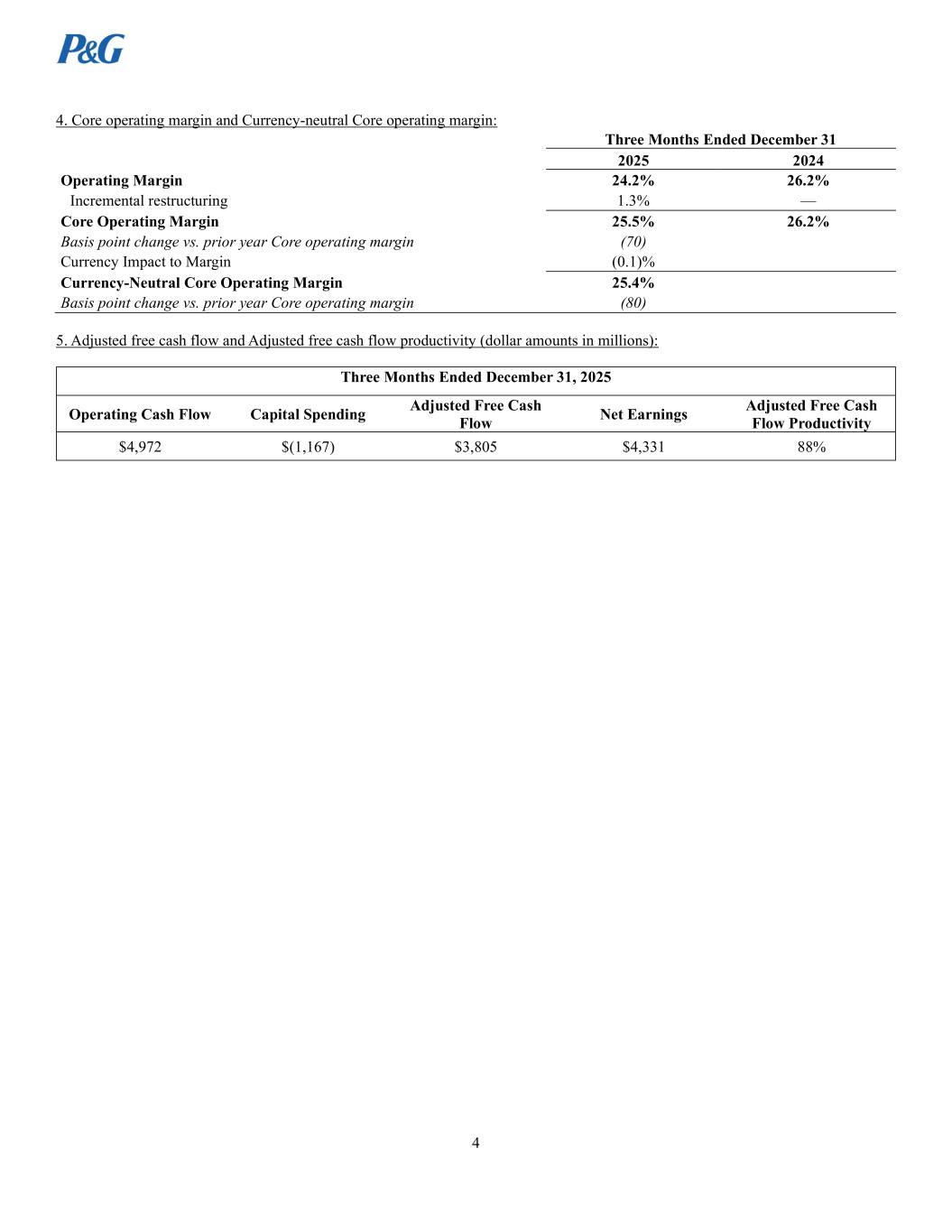 2 Core operating margin and currency-neutral Core operating margin: Core operating margin is a measure of the Company's operating margin adjusted for items as indicated. Currency-neutral Core operating margin is a measure of the Company’s Core operating margin excluding the incremental current year impact of foreign exchange. Management believes these non-GAAP measures provide a supplemental perspective to the Company’s operating efficiency over time. Adjusted free cash flow: Adjusted free cash flow is defined as operating cash flow less capital spending. Adjusted free cash flow represents the cash that the Company is able to generate after taking into account planned maintenance and asset expansion. We view adjusted free cash flow as an important measure because it is one factor used in determining the amount of cash available for dividends, share repurchases, acquisitions and other discretionary investments. Adjusted free cash flow productivity: Adjusted free cash flow productivity is defined as the ratio of adjusted free cash flow to net earnings. We view adjusted free cash flow productivity as a useful measure to help investors understand P&G’s ability to generate cash. This measure is used by management in making operating decisions, allocating financial resources and for budget planning purposes. This measure is also used in assessing the achievement of management goals for at-risk compensation. 1. Organic sales growth: Three Months Ended December 31, 2025 Net Sales Growth Foreign Exchange Impact Acquisition & Divestiture Impact/Other* Organic Sales Growth Beauty 5% (1)% —% 4% Grooming 2% (2)% —% —% Health Care 5% (2)% —% 3% Fabric Care & Home Care 1% (1)% —% —% Baby, Feminine & Family Care (3)% (1)% —% (4)% Total Company 1% (1)% —% —% * Acquisition & Divestiture Impact/Other includes the volume and mix impact of acquisitions and divestitures and rounding impacts necessary to reconcile net sales to organic sales. Prior Quarters Total Company Net Sales Growth Foreign Exchange Impact Acquisition/ Divestiture Impact/Other* Organic Sales Growth Q1 FY 2026 3% (1)% —% 2% Q4 FY 2025 2% —% —% 2% Q3 FY 2025 (2)% 2% 1% 1% Q2 FY 2025 2% —% 1% 3% Q1 FY 2025 (1)% 1% 2% 2% * Acquisition & Divestiture Impact/Other includes the volume and mix impact of acquisitions and divestitures and rounding impacts necessary to reconcile net sales to organic sales. Guidance Total Company Net Sales Growth Combined Foreign Exchange & Acquisition/Divestiture Impact/Other* Organic Sales Growth FY 2026 (Estimate) +1% to +5% -1% —% to +4% * Combined Foreign Exchange & Acquisition/Divestiture Impact/Other includes foreign exchange impacts, the volume and mix impact of acquisitions and divestitures and rounding impacts necessary to reconcile net sales to organic sales.