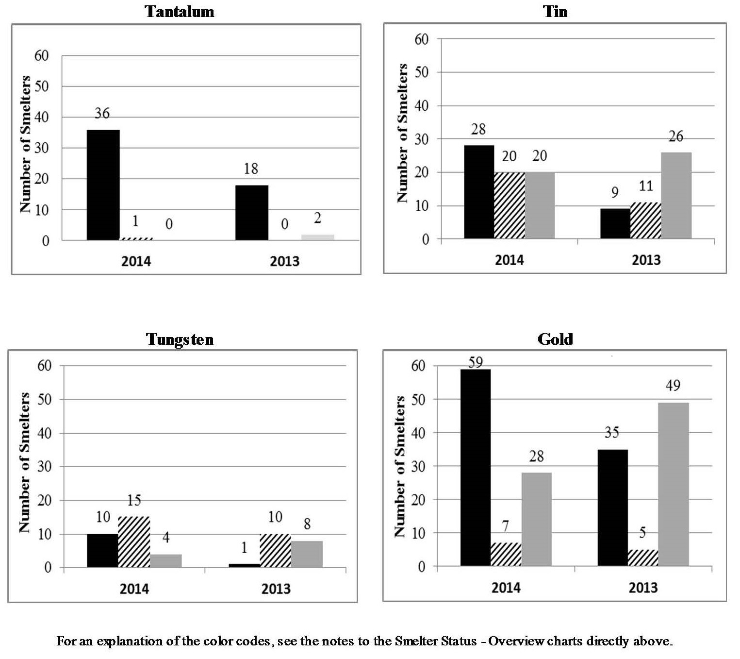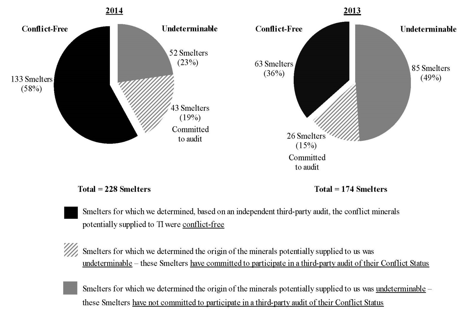 Despite these efforts, we do not have complete information about the CMs in the entirety of our supply chain. For 2014, over 40 percent of Suppliers identified Smelters in their supply chains on a company-wide, division or product-line basis, without specifying which Smelters were relevant to products they supplied to TI. (Accordingly we refer in this Conflict Minerals Report to Smelters as being “potentially” in our supply chain and as CMs “potentially” supplied to TI.) Industry efforts to collect and verify CM origin information remain incomplete. Although a significant percentage of our potential Smelters have committed to participate in a third-party audit of their Conflict Status, that status is currently undeterminable because the audits are not complete. The results of our due diligence, which are summarized in the charts below, reflect these limitations.