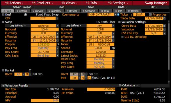 The yield on each Fixed Rate Obligation Amount (the “Yield”) shall be equal to the mid-market fixed coupon rate quoted on Bloomberg Swap Manager (Bloomberg page SWPM or any successor page) for a USD, monthly pay (both fixed and floating leg) swap versus one month LIBOR (subject to Exhibit D), with effective and maturity dates corresponding to those of the applicable Fixed Rate Obligation Amount (for illustration purposes only, such rate is shown as equal to 1.382763% per annum as illustrated below in a screen shot of Bloomberg page SWPM in Exhibit A1). The swap quote shall be based on a day count convention for the fixed leg of the swap of 30I/360 and a day count convention for the floating leg of the swap of Actual/365. The Yield will be calculated as a percentage to 6 decimal places.