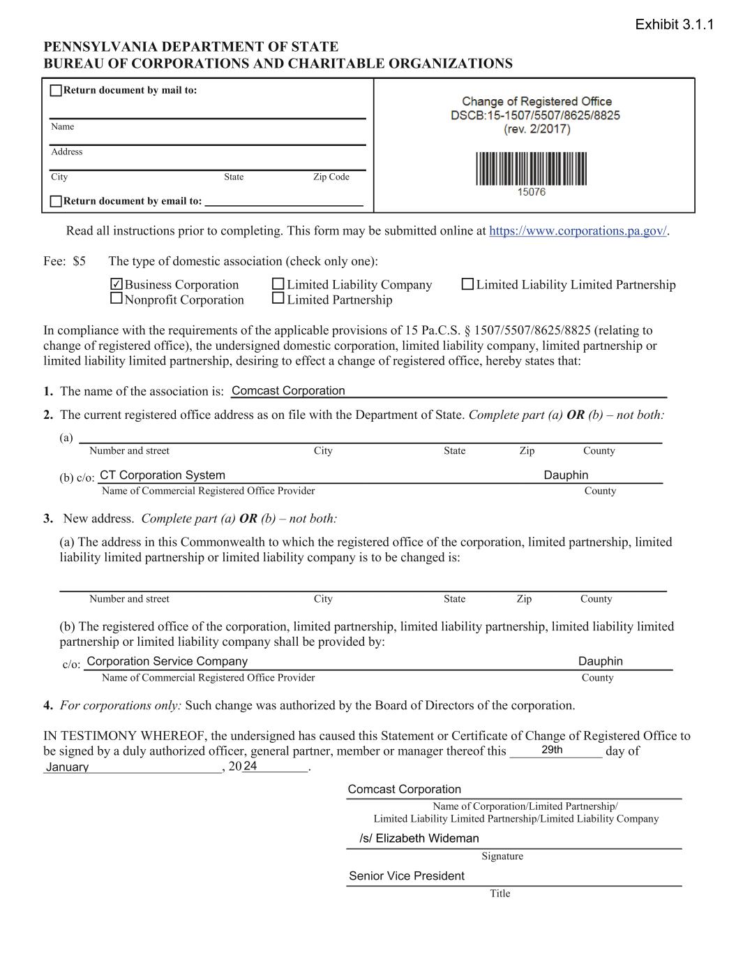 PENNSYLVANIA DEPARTMENT OF STATE BUREAU OF CORPORATIONS AND CHARITABLE ORGANIZATIONS Read all instructions prior to completing. This form may be submitted online at https://www.corporations.pa.gov/. Fee: $5 The type of domestic association (check only one): Business Corporation Limited Liability Company Limited Liability Limited Partnership Nonprofit Corporation Limited Partnership In compliance with the requirements of the applicable provisions of 15 Pa.C.S. § 1507/5507/8625/8825 (relating to change of registered office), the undersigned domestic corporation, limited liability company, limited partnership or limited liability limited partnership, desiring to effect a change of registered office, hereby states that: 1. The name of the association is: __________________________________________________________________ 2. The current registered office address as on file with the Department of State. Complete part (a) OR (b) – not both: (a) _________________________________________________________________________________________________ Number and street City State Zip County (b) c/o: ______________________________________________________________________________________________ Name of Commercial Registered Office Provider County 3. New address. Complete part (a) OR (b) – not both: (a) The address in this Commonwealth to which the registered office of the corporation, limited partnership, limited liability limited partnership or limited liability company is to be changed is: _____________________________________________________________________________________________________ Number and street City State Zip County (b) The registered office of the corporation, limited partnership, limited liability partnership, limited liability limited partnership or limited liability company shall be provided by: c/o: __________________________________________________________________________________________________ Name of Commercial Registered Office Provider County 4. For corporations only: Such change was authorized by the Board of Directors of the corporation. IN TESTIMONY WHEREOF, the undersigned has caused this Statement or Certificate of Change of Registered Office to be signed by a duly authorized officer, general partner, member or manager thereof this ______________ day of ___________________________, 20 . ______________________________________________________________ Name of Corporation/Limited Partnership/ Limited Liability Limited Partnership/Limited Liability Company ______________________________________________________________ Signature ______________________________________________________________ Title Return document by mail to: Name Address City State Zip Code Return document by email to: _________________________________ ✔ Comcast Corporation CT Corporation System Dauphin DauphinCorporation Service Company January Comcast Corporation 24 Senior Vice President /s/ Elizabeth Wideman Exhibit 3.1.1 29th