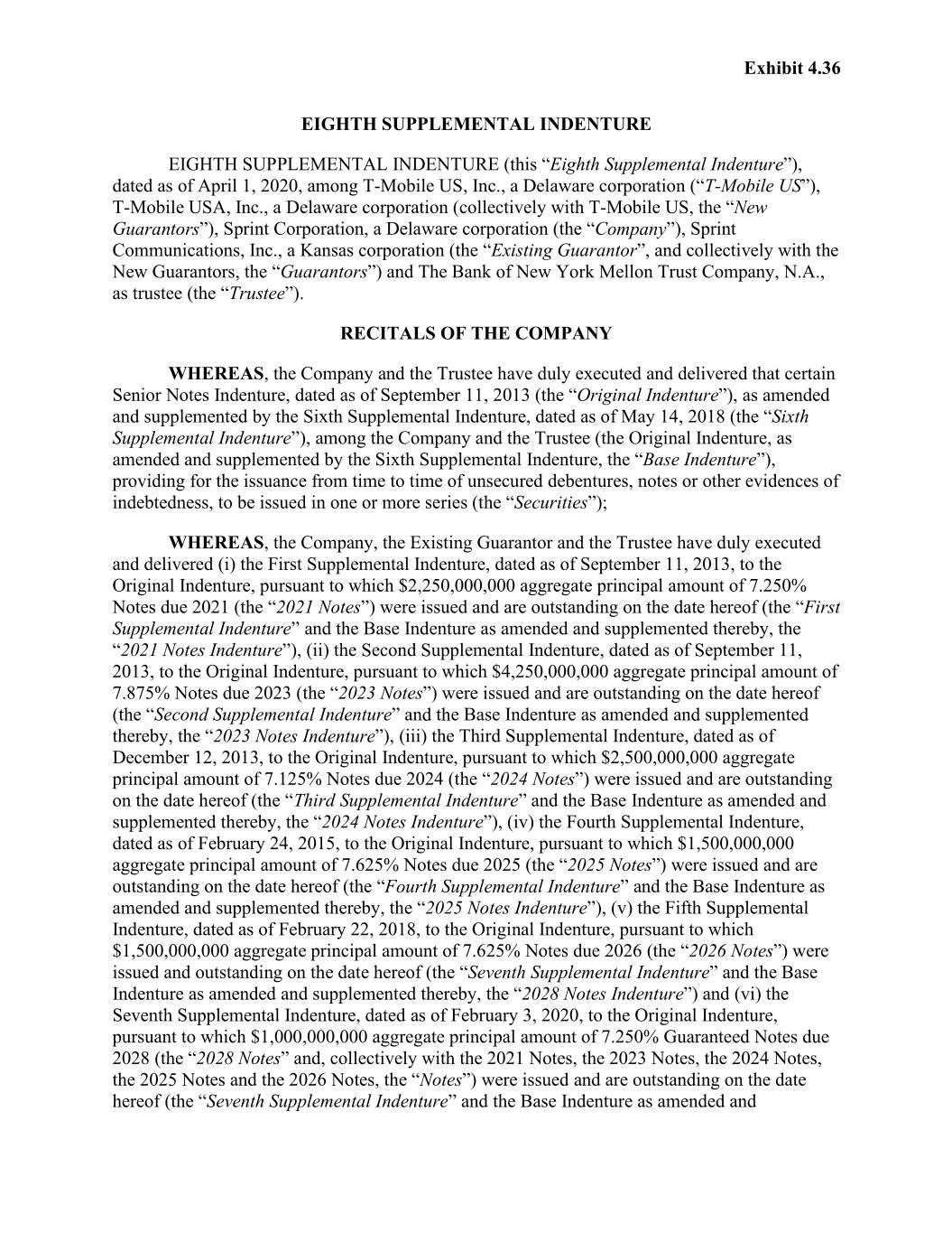 Exhibit 4.36 EIGHTH SUPPLEMENTAL INDENTURE EIGHTH SUPPLEMENTAL INDENTURE (this “Eighth Supplemental Indenture”), dated as of April 1, 2020, among T-Mobile US, Inc., a Delaware corporation (“T-Mobile US”), T-Mobile USA, Inc., a Delaware corporation (collectively with T-Mobile US, the “New Guarantors”), Sprint Corporation, a Delaware corporation (the “Company”), Sprint Communications, Inc., a Kansas corporation (the “Existing Guarantor”, and collectively with the New Guarantors, the “Guarantors”) and The Bank of New York Mellon Trust Company, N.A., as trustee (the “Trustee”). RECITALS OF THE COMPANY WHEREAS, the Company and the Trustee have duly executed and delivered that certain Senior Notes Indenture, dated as of September 11, 2013 (the “Original Indenture”), as amended and supplemented by the Sixth Supplemental Indenture, dated as of May 14, 2018 (the “Sixth Supplemental Indenture”), among the Company and the Trustee (the Original Indenture, as amended and supplemented by the Sixth Supplemental Indenture, the “Base Indenture”), providing for the issuance from time to time of unsecured debentures, notes or other evidences of indebtedness, to be issued in one or more series (the “Securities”); WHEREAS, the Company, the Existing Guarantor and the Trustee have duly executed and delivered (i) the First Supplemental Indenture, dated as of September 11, 2013, to the Original Indenture, pursuant to which $2,250,000,000 aggregate principal amount of 7.250% Notes due 2021 (the “2021 Notes”) were issued and are outstanding on the date hereof (the “First Supplemental Indenture” and the Base Indenture as amended and supplemented thereby, the “2021 Notes Indenture”), (ii) the Second Supplemental Indenture, dated as of September 11, 2013, to the Original Indenture, pursuant to which $4,250,000,000 aggregate principal amount of 7.875% Notes due 2023 (the “2023 Notes”) were issued and are outstanding on the date hereof (the “Second Supplemental Indenture” and the Base Indenture as amended and supplemented thereby, the “2023 Notes Indenture”), (iii) the Third Supplemental Indenture, dated as of December 12, 2013, to the Original Indenture, pursuant to which $2,500,000,000 aggregate principal amount of 7.125% Notes due 2024 (the “2024 Notes”) were issued and are outstanding on the date hereof (the “Third Supplemental Indenture” and the Base Indenture as amended and supplemented thereby, the “2024 Notes Indenture”), (iv) the Fourth Supplemental Indenture, dated as of February 24, 2015, to the Original Indenture, pursuant to which $1,500,000,000 aggregate principal amount of 7.625% Notes due 2025 (the “2025 Notes”) were issued and are outstanding on the date hereof (the “Fourth Supplemental Indenture” and the Base Indenture as amended and supplemented thereby, the “2025 Notes Indenture”), (v) the Fifth Supplemental Indenture, dated as of February 22, 2018, to the Original Indenture, pursuant to which $1,500,000,000 aggregate principal amount of 7.625% Notes due 2026 (the “2026 Notes”) were issued and outstanding on the date hereof (the “Seventh Supplemental Indenture” and the Base Indenture as amended and supplemented thereby, the “2028 Notes Indenture”) and (vi) the Seventh Supplemental Indenture, dated as of February 3, 2020, to the Original Indenture, pursuant to which $1,000,000,000 aggregate principal amount of 7.250% Guaranteed Notes due 2028 (the “2028 Notes” and, collectively with the 2021 Notes, the 2023 Notes, the 2024 Notes, the 2025 Notes and the 2026 Notes, the “Notes”) were issued and are outstanding on the date hereof (the “Seventh Supplemental Indenture” and the Base Indenture as amended and