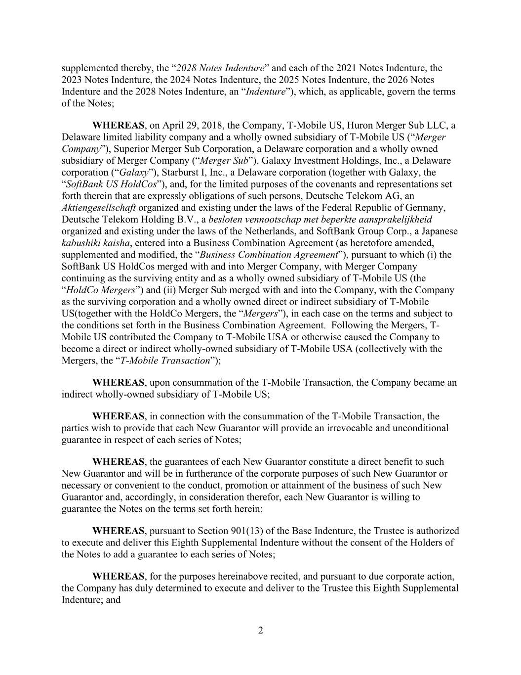 supplemented thereby, the “2028 Notes Indenture” and each of the 2021 Notes Indenture, the 2023 Notes Indenture, the 2024 Notes Indenture, the 2025 Notes Indenture, the 2026 Notes Indenture and the 2028 Notes Indenture, an “Indenture”), which, as applicable, govern the terms of the Notes; WHEREAS, on April 29, 2018, the Company, T-Mobile US, Huron Merger Sub LLC, a Delaware limited liability company and a wholly owned subsidiary of T-Mobile US (“Merger Company”), Superior Merger Sub Corporation, a Delaware corporation and a wholly owned subsidiary of Merger Company (“Merger Sub”), Galaxy Investment Holdings, Inc., a Delaware corporation (“Galaxy”), Starburst I, Inc., a Delaware corporation (together with Galaxy, the “SoftBank US HoldCos”), and, for the limited purposes of the covenants and representations set forth therein that are expressly obligations of such persons, Deutsche Telekom AG, an Aktiengesellschaft organized and existing under the laws of the Federal Republic of Germany, Deutsche Telekom Holding B.V., a besloten vennootschap met beperkte aansprakelijkheid organized and existing under the laws of the Netherlands, and SoftBank Group Corp., a Japanese kabushiki kaisha, entered into a Business Combination Agreement (as heretofore amended, supplemented and modified, the “Business Combination Agreement”), pursuant to which (i) the SoftBank US HoldCos merged with and into Merger Company, with Merger Company continuing as the surviving entity and as a wholly owned subsidiary of T-Mobile US (the “HoldCo Mergers”) and (ii) Merger Sub merged with and into the Company, with the Company as the surviving corporation and a wholly owned direct or indirect subsidiary of T-Mobile US(together with the HoldCo Mergers, the “Mergers”), in each case on the terms and subject to the conditions set forth in the Business Combination Agreement. Following the Mergers, T- Mobile US contributed the Company to T-Mobile USA or otherwise caused the Company to become a direct or indirect wholly-owned subsidiary of T-Mobile USA (collectively with the Mergers, the “T-Mobile Transaction”); WHEREAS, upon consummation of the T-Mobile Transaction, the Company became an indirect wholly-owned subsidiary of T-Mobile US; WHEREAS, in connection with the consummation of the T-Mobile Transaction, the parties wish to provide that each New Guarantor will provide an irrevocable and unconditional guarantee in respect of each series of Notes; WHEREAS, the guarantees of each New Guarantor constitute a direct benefit to such New Guarantor and will be in furtherance of the corporate purposes of such New Guarantor or necessary or convenient to the conduct, promotion or attainment of the business of such New Guarantor and, accordingly, in consideration therefor, each New Guarantor is willing to guarantee the Notes on the terms set forth herein; WHEREAS, pursuant to Section 901(13) of the Base Indenture, the Trustee is authorized to execute and deliver this Eighth Supplemental Indenture without the consent of the Holders of the Notes to add a guarantee to each series of Notes; WHEREAS, for the purposes hereinabove recited, and pursuant to due corporate action, the Company has duly determined to execute and deliver to the Trustee this Eighth Supplemental Indenture; and 2