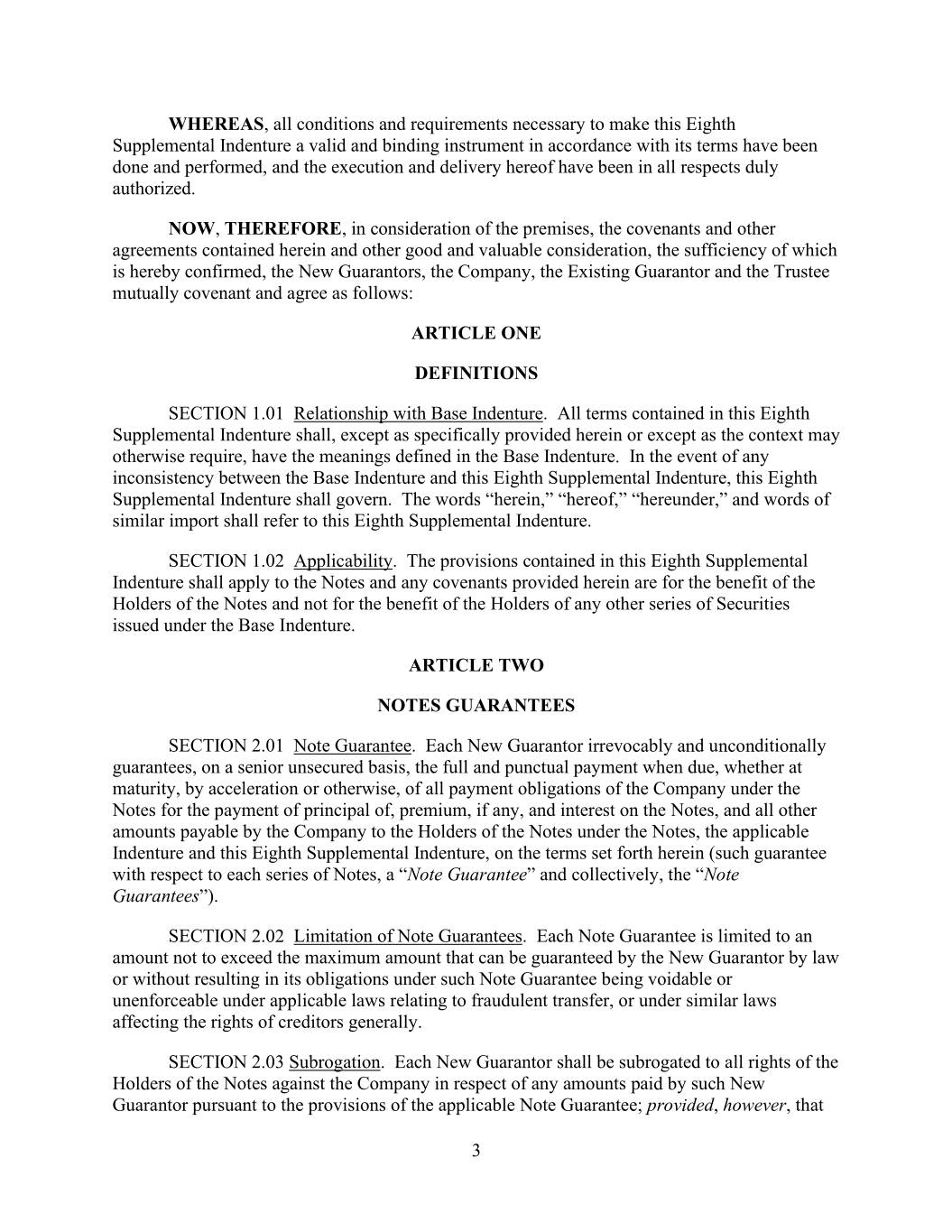 WHEREAS, all conditions and requirements necessary to make this Eighth Supplemental Indenture a valid and binding instrument in accordance with its terms have been done and performed, and the execution and delivery hereof have been in all respects duly authorized. NOW, THEREFORE, in consideration of the premises, the covenants and other agreements contained herein and other good and valuable consideration, the sufficiency of which is hereby confirmed, the New Guarantors, the Company, the Existing Guarantor and the Trustee mutually covenant and agree as follows: ARTICLE ONE DEFINITIONS SECTION 1.01 Relationship with Base Indenture. All terms contained in this Eighth Supplemental Indenture shall, except as specifically provided herein or except as the context may otherwise require, have the meanings defined in the Base Indenture. In the event of any inconsistency between the Base Indenture and this Eighth Supplemental Indenture, this Eighth Supplemental Indenture shall govern. The words “herein,” “hereof,” “hereunder,” and words of similar import shall refer to this Eighth Supplemental Indenture. SECTION 1.02 Applicability. The provisions contained in this Eighth Supplemental Indenture shall apply to the Notes and any covenants provided herein are for the benefit of the Holders of the Notes and not for the benefit of the Holders of any other series of Securities issued under the Base Indenture. ARTICLE TWO NOTES GUARANTEES SECTION 2.01 Note Guarantee. Each New Guarantor irrevocably and unconditionally guarantees, on a senior unsecured basis, the full and punctual payment when due, whether at maturity, by acceleration or otherwise, of all payment obligations of the Company under the Notes for the payment of principal of, premium, if any, and interest on the Notes, and all other amounts payable by the Company to the Holders of the Notes under the Notes, the applicable Indenture and this Eighth Supplemental Indenture, on the terms set forth herein (such guarantee with respect to each series of Notes, a “Note Guarantee” and collectively, the “Note Guarantees”). SECTION 2.02 Limitation of Note Guarantees. Each Note Guarantee is limited to an amount not to exceed the maximum amount that can be guaranteed by the New Guarantor by law or without resulting in its obligations under such Note Guarantee being voidable or unenforceable under applicable laws relating to fraudulent transfer, or under similar laws affecting the rights of creditors generally. SECTION 2.03 Subrogation. Each New Guarantor shall be subrogated to all rights of the Holders of the Notes against the Company in respect of any amounts paid by such New Guarantor pursuant to the provisions of the applicable Note Guarantee; provided, however, that 3