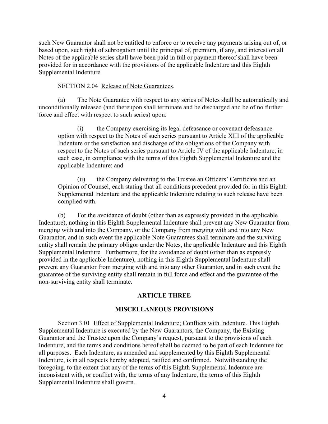 such New Guarantor shall not be entitled to enforce or to receive any payments arising out of, or based upon, such right of subrogation until the principal of, premium, if any, and interest on all Notes of the applicable series shall have been paid in full or payment thereof shall have been provided for in accordance with the provisions of the applicable Indenture and this Eighth Supplemental Indenture. SECTION 2.04 Release of Note Guarantees. (a) The Note Guarantee with respect to any series of Notes shall be automatically and unconditionally released (and thereupon shall terminate and be discharged and be of no further force and effect with respect to such series) upon: (i) the Company exercising its legal defeasance or covenant defeasance option with respect to the Notes of such series pursuant to Article XIII of the applicable Indenture or the satisfaction and discharge of the obligations of the Company with respect to the Notes of such series pursuant to Article IV of the applicable Indenture, in each case, in compliance with the terms of this Eighth Supplemental Indenture and the applicable Indenture; and (ii) the Company delivering to the Trustee an Officers’ Certificate and an Opinion of Counsel, each stating that all conditions precedent provided for in this Eighth Supplemental Indenture and the applicable Indenture relating to such release have been complied with. (b) For the avoidance of doubt (other than as expressly provided in the applicable Indenture), nothing in this Eighth Supplemental Indenture shall prevent any New Guarantor from merging with and into the Company, or the Company from merging with and into any New Guarantor, and in such event the applicable Note Guarantees shall terminate and the surviving entity shall remain the primary obligor under the Notes, the applicable Indenture and this Eighth Supplemental Indenture. Furthermore, for the avoidance of doubt (other than as expressly provided in the applicable Indenture), nothing in this Eighth Supplemental Indenture shall prevent any Guarantor from merging with and into any other Guarantor, and in such event the guarantee of the surviving entity shall remain in full force and effect and the guarantee of the non-surviving entity shall terminate. ARTICLE THREE MISCELLANEOUS PROVISIONS Section 3.01 Effect of Supplemental Indenture; Conflicts with Indenture. This Eighth Supplemental Indenture is executed by the New Guarantors, the Company, the Existing Guarantor and the Trustee upon the Company’s request, pursuant to the provisions of each Indenture, and the terms and conditions hereof shall be deemed to be part of each Indenture for all purposes. Each Indenture, as amended and supplemented by this Eighth Supplemental Indenture, is in all respects hereby adopted, ratified and confirmed. Notwithstanding the foregoing, to the extent that any of the terms of this Eighth Supplemental Indenture are inconsistent with, or conflict with, the terms of any Indenture, the terms of this Eighth Supplemental Indenture shall govern. 4