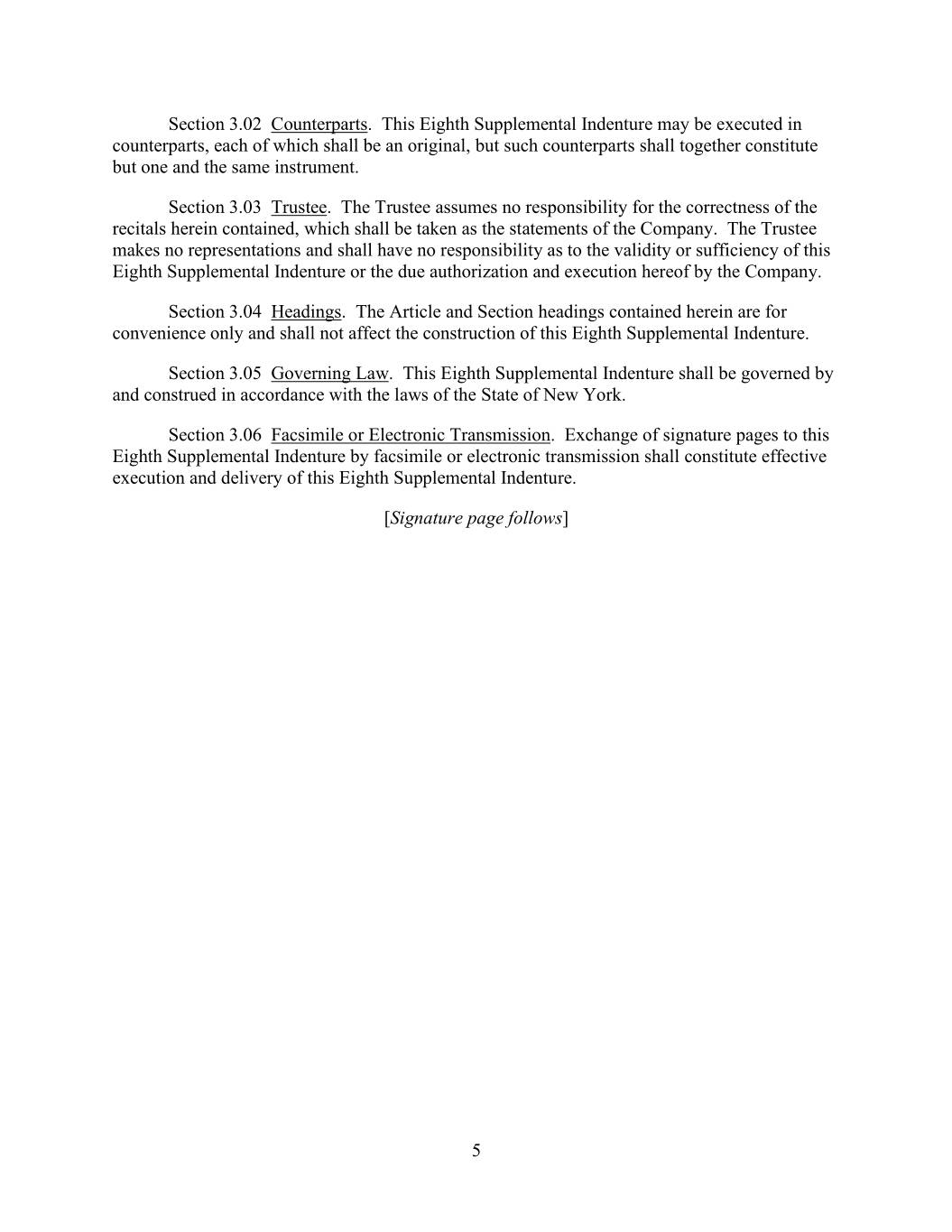 Section 3.02 Counterparts. This Eighth Supplemental Indenture may be executed in counterparts, each of which shall be an original, but such counterparts shall together constitute but one and the same instrument. Section 3.03 Trustee. The Trustee assumes no responsibility for the correctness of the recitals herein contained, which shall be taken as the statements of the Company. The Trustee makes no representations and shall have no responsibility as to the validity or sufficiency of this Eighth Supplemental Indenture or the due authorization and execution hereof by the Company. Section 3.04 Headings. The Article and Section headings contained herein are for convenience only and shall not affect the construction of this Eighth Supplemental Indenture. Section 3.05 Governing Law. This Eighth Supplemental Indenture shall be governed by and construed in accordance with the laws of the State of New York. Section 3.06 Facsimile or Electronic Transmission. Exchange of signature pages to this Eighth Supplemental Indenture by facsimile or electronic transmission shall constitute effective execution and delivery of this Eighth Supplemental Indenture. [Signature page follows] 5