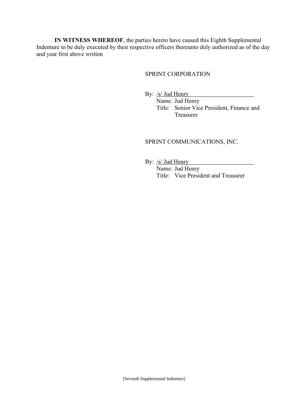 IN WITNESS WHEREOF, the parties hereto have caused this Eighth Supplemental Indenture to be duly executed by their respective officers thereunto duly authorized as of the day and year first above written SPRINT CORPORATION By: /s/ Jud Henry Name: Jud Henry Title: Senior Vice President, Finance and Treasurer SPRINT COMMUNICATIONS, INC. By: /s/ Jud Henry Name: Jud Henry Title: Vice President and Treasurer [Seventh Supplemental Indenture]